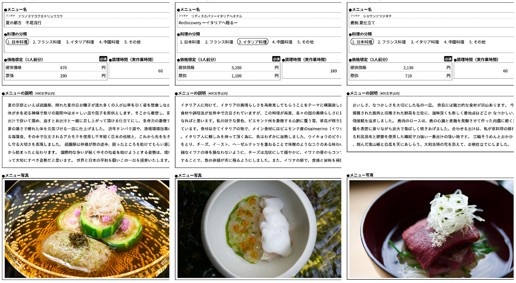 ・応募者は、メニューシートに記載した内容は応募者オリジナルの物であり、第三者の著作権(著作権法第27条及び第28条の権利を含む。以下同じ)、商標権等の知的財産権(以下「知的財産権等」といいます)を侵害していないことを保証します。