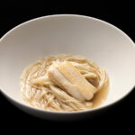 韓国にはシッケという伝統料理がある。日本のなれ鮨と同じく主食で手に入りやすい穀物を使った魚の保存食で、一般的に小さめのカレイを丸ごと使って酸で柔らかくなった骨まで食べる。今回は骨は除き、身は崩して発酵の酸味があるサルサのようにして刺身と合わせるが、アワやキビの代わりに米麹を使うことでもっと旨味がある結果になる。これに辛味がある韓国の大根と違って甘味と旨味が強い日本の大根も一緒に漬けて添える。椎茸はカビが生える直前の状態を保ちつつ熟成させながら乾燥させて麹で醤油にし、スープの味付けに使う。カッペリーニはカン水に戻してからもちっとした食感に茹で上げることで咀嚼回数を増やし、料理の旨みを最後まで感じるようにした。出汁にもさまざまな材料が入るなど、味付けは韓国の足し算にしているが、お皿には余計なパーツを減らし食べる側からは日本料理の引き算を感じるよにした。