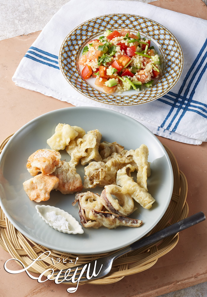メニュー名:魚介ときのこのフリット・彩り野菜のクスクスサラダ