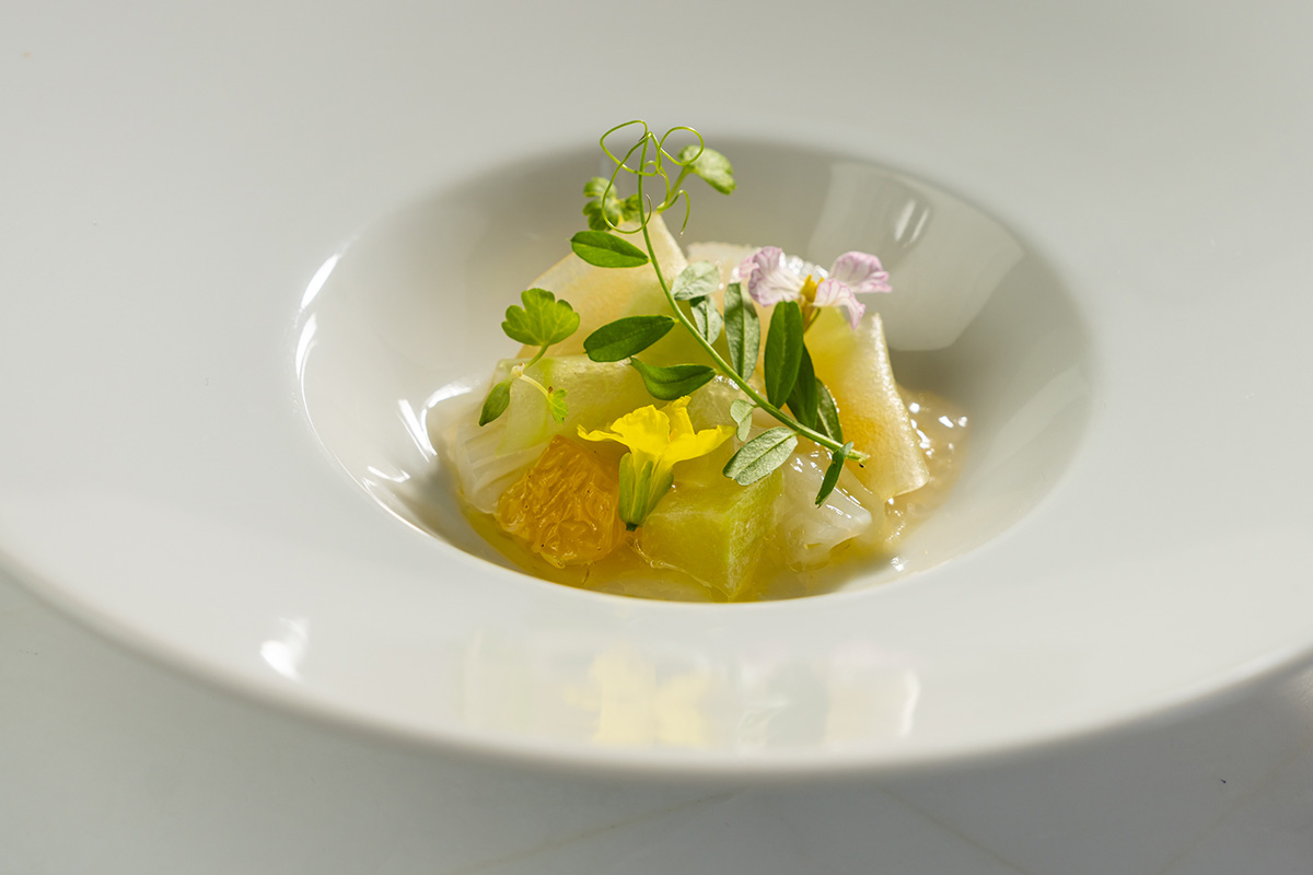 2ヶ月間熟成させた能登たんぽぽファームの仔牛の塩漬けに、RED U-35 2023の最終審査でも使用した蜂蜜、味噌、蕪を合わせて。