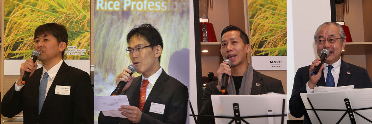 左から、 農林水産省 荒田耕士朗氏、在香港日本国総領事館 廣田司氏、日本米食味鑑定士 Alvin Hui氏、木徳神糧株式会社 松本裕之氏