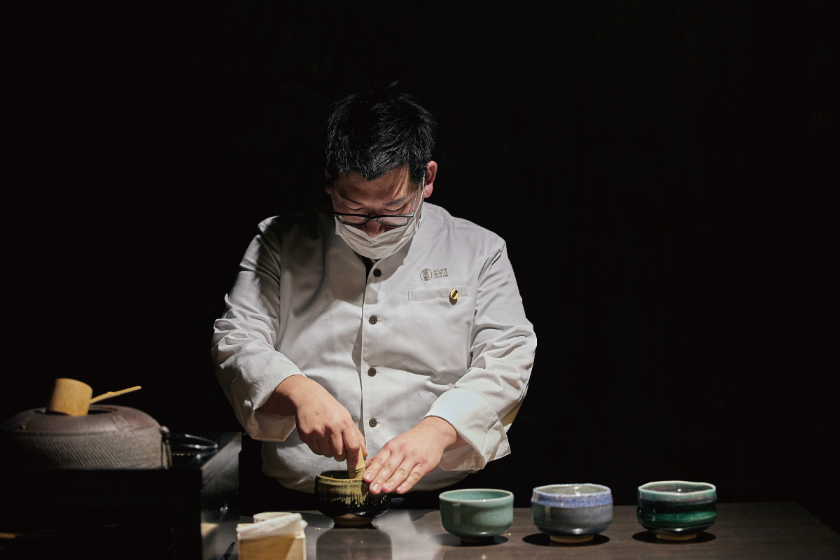 最後の皿となったデザートを名残惜しげに食べ終えたゲストたちのために、川嶋シェフが抹茶を点てはじめた。心のこもった一服を飲み干すと、二時間半に及ぶコース料理は終了した。