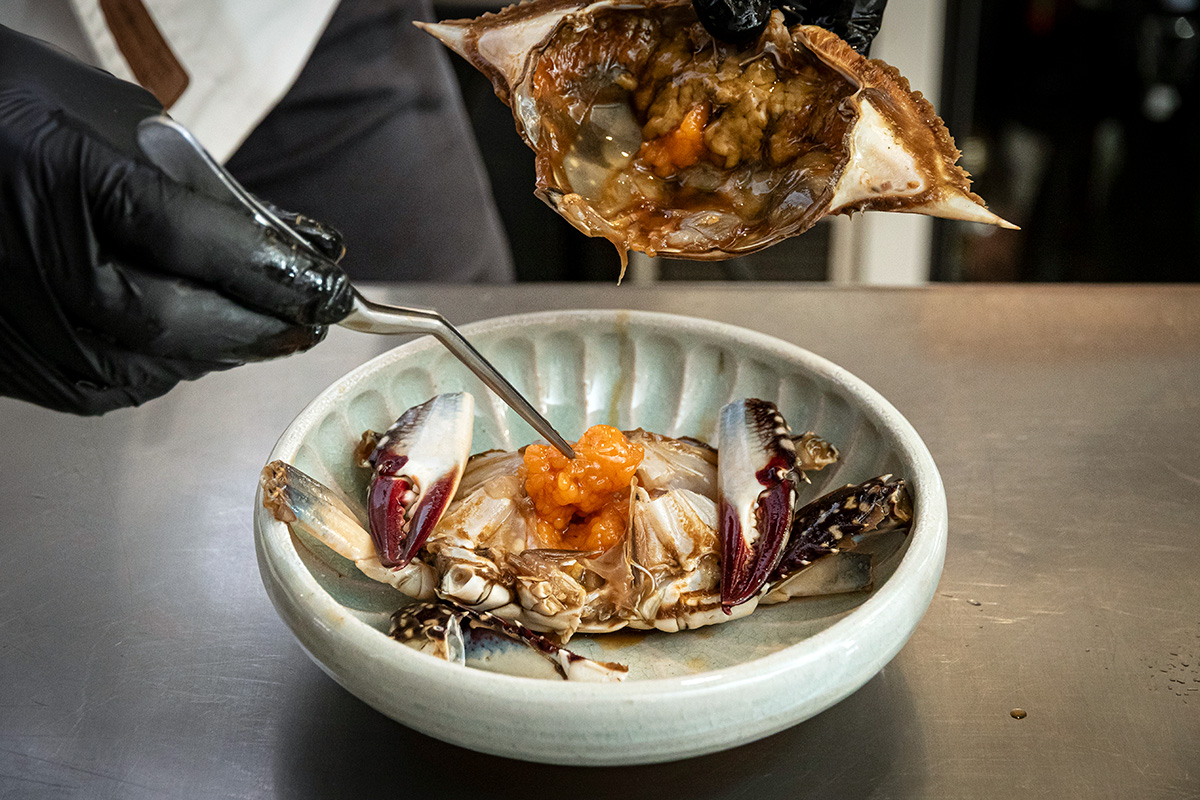 本物の韓国料理を提供していきたいと語る李氏の「カンジャンケジャン」。季節によって北海道・函館や、熊本・天草産のワタリガニを用いている。「日本のカニは本当においしいです。昔と異なり、現在は優れた急速冷凍技術もあるので、素材に火を入れて殺菌する必要はありません。上質の味わいを活かすには、伝統的な調理法にこだわる必要はないと考えています」。日本の美意識と韓国の伝統、そして現代のガストロノミーが交差するこの場所でしか生まれ得ない古くて新しい韓国料理だ。