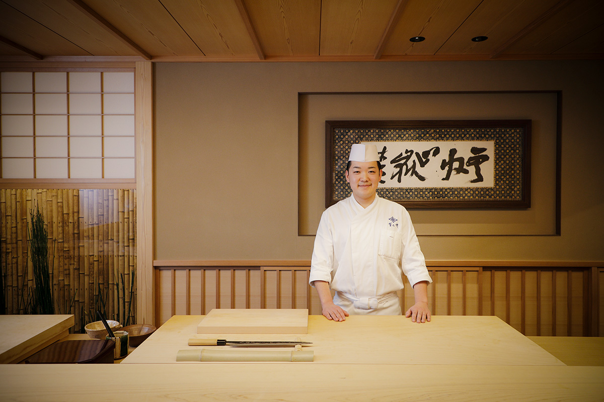 佐藤氏の料理人としての歩みは、2019年に京都の名門「菊乃井 本店」の門を叩いたことからはじまる。ミシュラン3つ星を守り続け、日本料理界を牽引し続ける村田吉弘氏のもとで、「なぜこの店がトップランナーであり続けられるのか」という答えを探す日々。現在は2024年にオープンした「菊乃井 鮨⻘ 肉雲収」のカウンターに立ち、客人と向き合いながら、理想の「もてなし」を追求している。