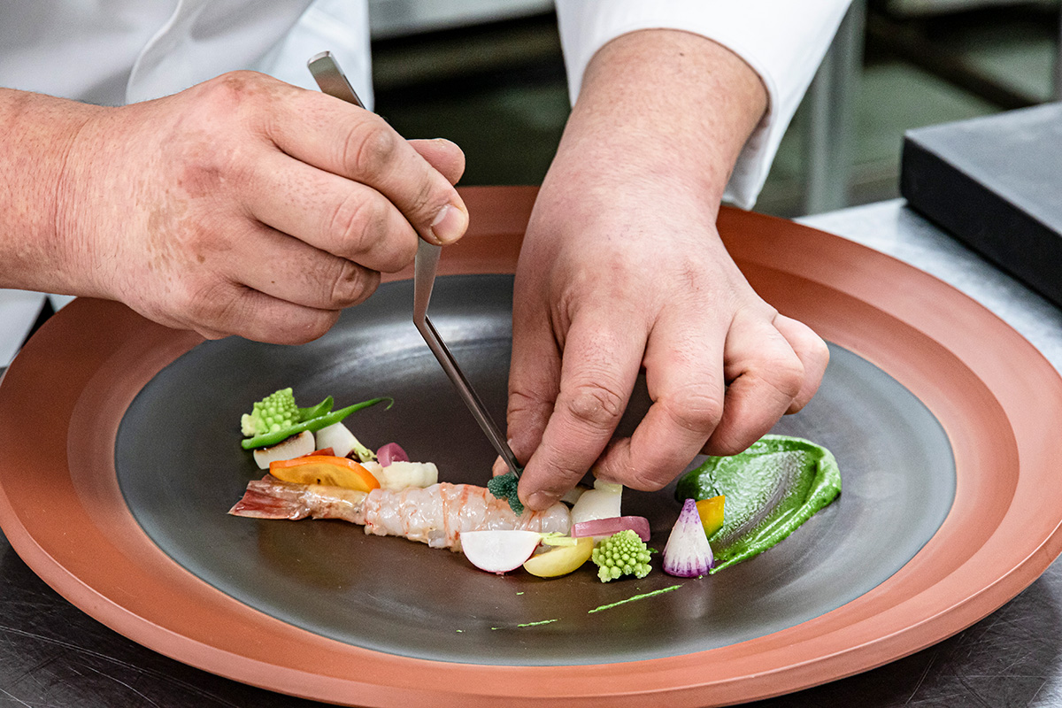 写真のひと皿はその最たるもの。ミネラル豊富な軟水によって育まれた力強い味わいの野菜や、寒ブリや南蛮エビといった極上の魚介がそろう佐渡の恵みを、ソースとともに味わう紛うことなきフランス料理だ。佐渡の誇りとなった若きシェフが紡ぐ新たなスペシャリテに、世界の注目が集まっている。