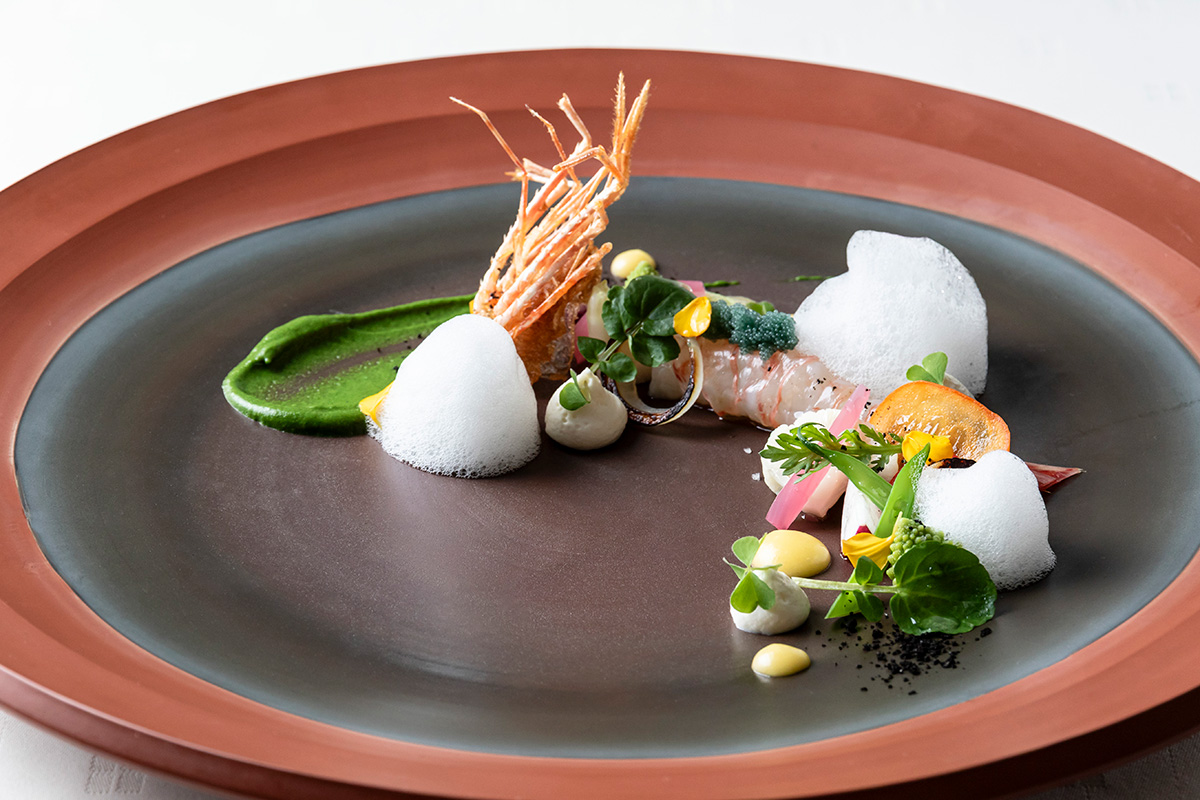 【料理】 佐渡島ではタラバエビとも称される冬の味覚であるボタンエビと、ロマネスコやプチトマト、アカダイコン、ラディッシュ、オケサガキなど海と山の幸をフランス料理仕立てで表現したひと皿。ユズの泡、ホウレンソウのピューレ、カリフラワーのムースなどでいただく。ロマネスコやハーブ類などこれまで島では栽培されていなかった食材も、地元生産者の協力もあり今では新鮮なものが日々届けられるという。