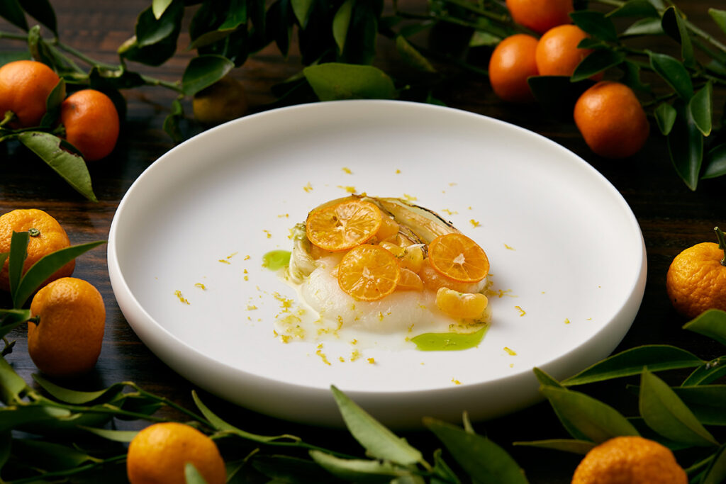【料理】 奈良伝統野菜の今市蕪を、水、塩、青い四季橘(未完熟の四季橘)のシロップを入れたピュレに、熟れた橘の香りと酸味、そして日本最古のみかんとされる大和橘の甘みを最大限に生かした果肉と果汁ジュレを合わせ、四季橘のスライスを乗せて。最終審査の際に創り上げたメニュー「命を紡ぐ、収穫。」を、奈良で出会った食材(大和橘、四季橘、今市蕪)にて再現したひと皿。
