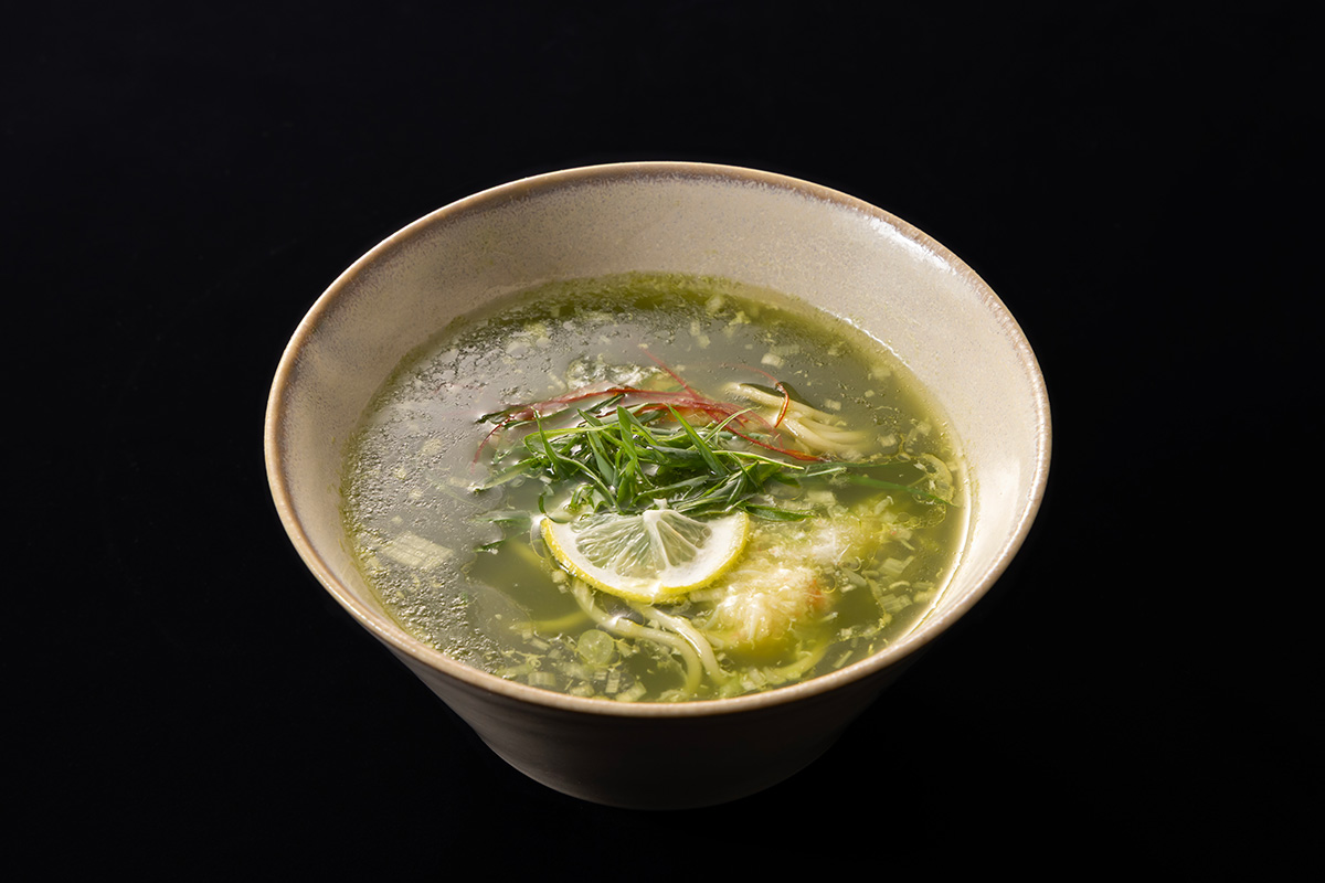 6番手に登場した丸山千里氏は、企業や生産者の依頼に応じて、料理人の知見を生かした商品開発に携わるフードクリエイターだ。そんな丸山氏が披露したのは、熊本県産の抹茶を用い、少量の生クリームと山椒、青唐辛子でアクセントを加えた「蟹と柑橘の抹茶ラーメン」。「慣習にとらわれることなく日本の食材の新たな魅力をアピールしたい」と語る丸山氏が着目したのは、抹茶の持つうまみ成分とコク。鶏ガラのうまみとの相乗効果で化学調味料に頼らない力強い味わいとなり、審査員をうならせるひと皿となった。三次審査の個人面談で「食材の価値を最大限に引き出し、驚きと発見のある食体験を大切にしている」と楽しげに語っていた丸山氏の渾身の自信作といえるだろう。