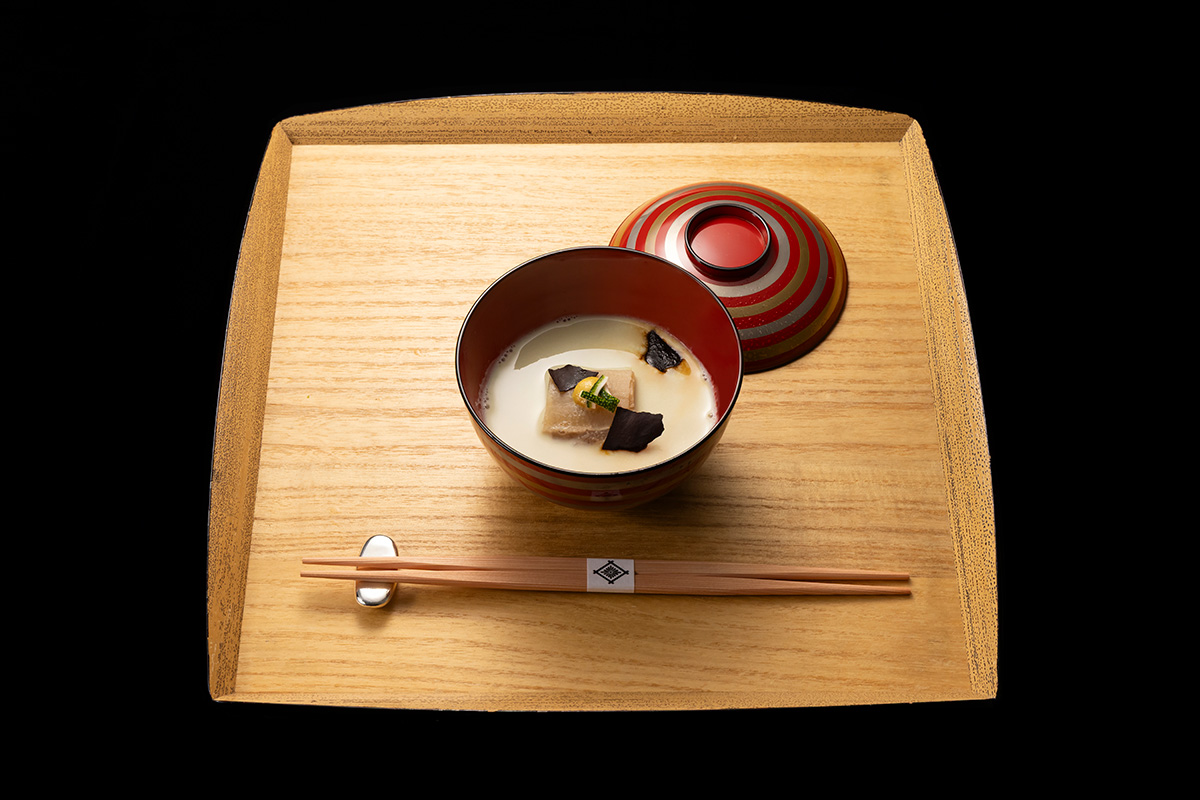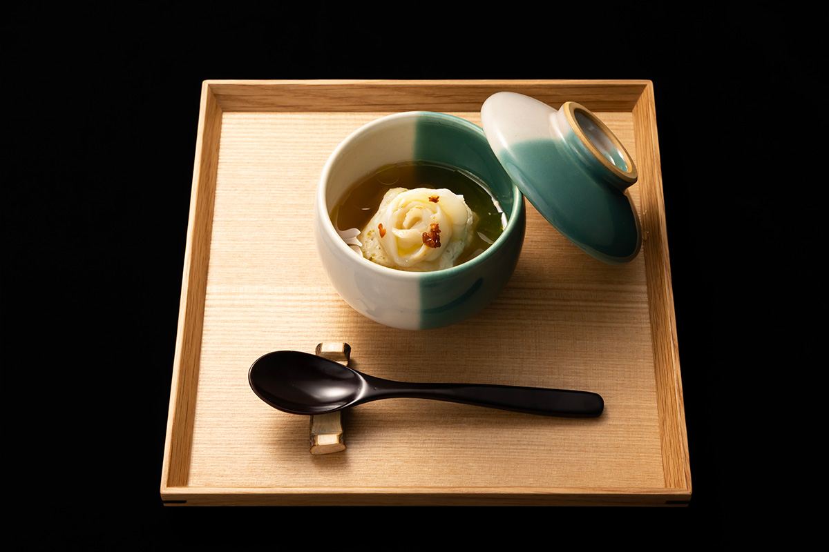 日本料理の真髄ともいえる椀もので勝負に挑んだのは、5番手に登場した京都・東山の日本料理店「菊乃井 鮨青 肉雲収」所属の佐藤歩氏。氏が披露したのは、地元栃木の生産量日本一を誇る干瓢を素材に、精進出汁に豆乳クリーム、味噌シートなどでアクセントを加えたもの。「夏の物語 世界へ」と名付けられたこの料理は、幼いころに祖母と干瓢を採った夏休みの思い出から着想されたもの。そこには「日本の食文化や伝統的な食材を世界に広め、地方の未来に光を届けたい」という佐藤氏の強い想いが込められている。