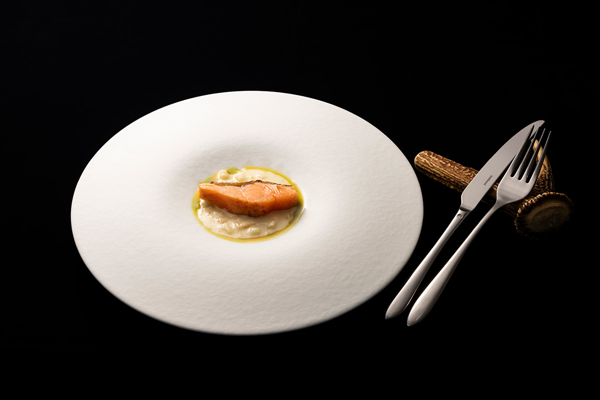 吉武広樹氏から「鱒と麹のソースを混ぜ合わせることをしなかったのはなぜか?」と問われると、「朧げな『無限』を表現したかったから。19歳の時に渡ったフランスでは、そこでさまざまな文化が交ざりあい、色んな食材が使われていることを知った。自分が思うフランス料理を日本の食材で作り上げたかった」と、確固たるアイデンティティを貫いた。