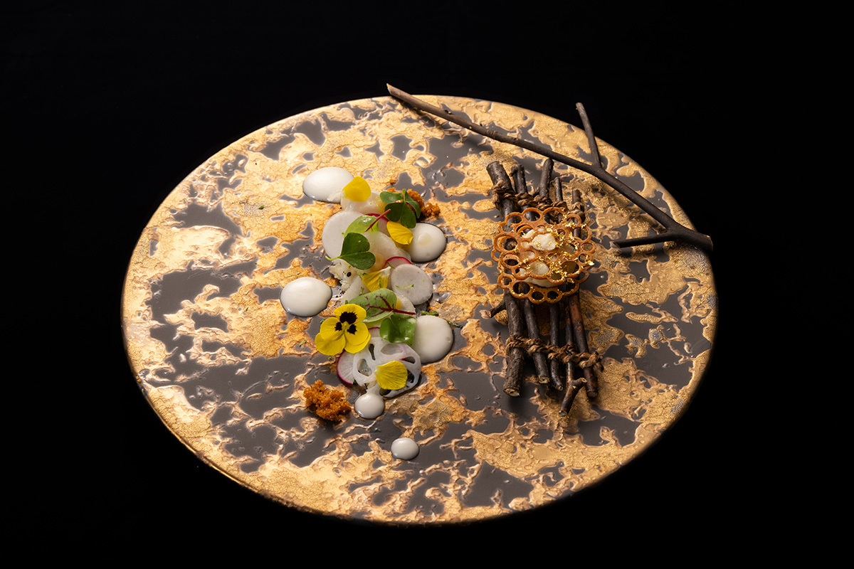 「まずはクロモジの枝を折り、香りを堪能してほしい」とプレゼンをスタートさせたのは、4番手に登場した新潟・佐渡島出身の「La Plage」のシェフ 須藤良隆氏。金色の皿に盛り付けられた「佐渡の埋もれる宝」と題された料理は、山海の恵み、伝統文化、自らのルーツをフランス料理に昇華させたもの。ふぐを特製の塩麹でマリネし少し炙ることで、生と焼きの香ばしさのコントラストを強調。佐渡に伝わる河豚真子の粕漬け文化へのオマージュとして、発酵によるうまみを重ね、幼少期からの“食の記憶”をひと皿に見事に表現してみせた。
