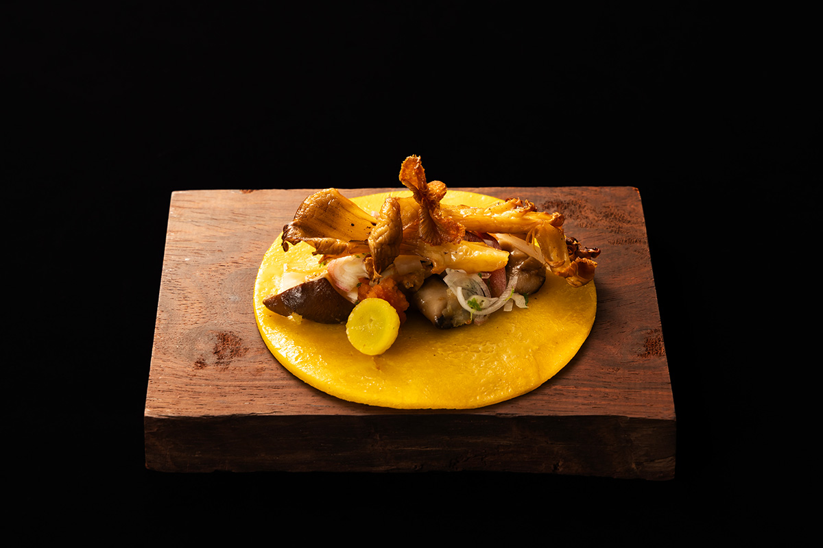 8番手は、2024年12月に京都・花園でフランス料理レストラン「wavie」をオープンさせたばかりのオーナーシェフ 田村和儀氏。氏が披露したのは、フランス料理をベースに、山菜の苦味を引き出し、グルテンフリーかつ動物性不使用に仕立てた「ひと巻きの風土〈秋分〉」と題された料理。「海外のゲストなど、どんな方に提供しても食べていただきやすいものとはなんだろう? まずはそこから構想をスタートさせた」という、ジャンルレスで味わい深い料理には、秋の味覚と静かな闘志が包み込まれていた。