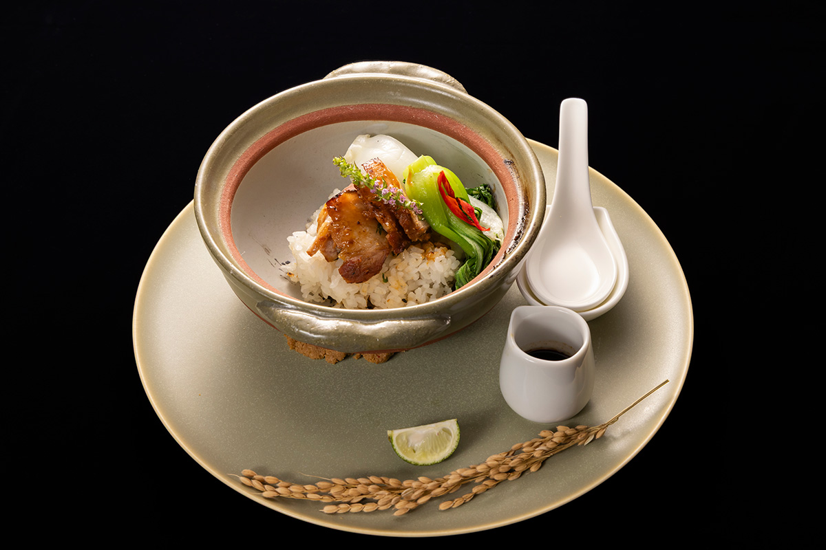 3番手は、三次審査の個人面談で「変人であり続けたい」というアピールとともに存在感を示した「ウェスティンホテル東京 龍天門」の料理人 向田侑司氏。「炎との対話」を大切にしてきた氏が、「焼きおにぎりのようなものをイメージした」と語る、「好風」と題されたひと皿のテーマは「香り」だった。鴨肉には麹と中国酒で風味づけし、豚バラ肉は香ばしく焼き上げ、味噌の風味を引き立てた。「中国料理において、香りは重要な要素のひとつ。日本において中国料理を追究する料理人として、中国にはない日本ならではの香りや旬の食材を生かした中国料理を表現した」。麹香るひと皿には、中国料理人らしいテクニックと想いが凝縮れていた。