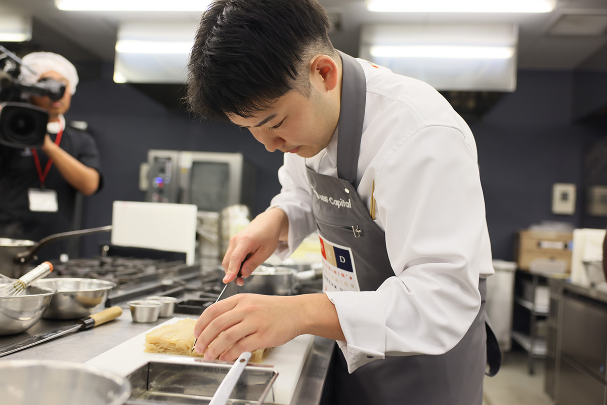 ちなみに、試食審査室との仕切りは基本閉められ、審査員は調理室に入室して見学。進行後、審査員の希望もあり、短時間ではあるが仕切りを開いての見学を可とした(審査途中から数名)。手元の作業に集中しなければならない挑戦者は、普段とは異なる緊張感を感じていたはずだ。