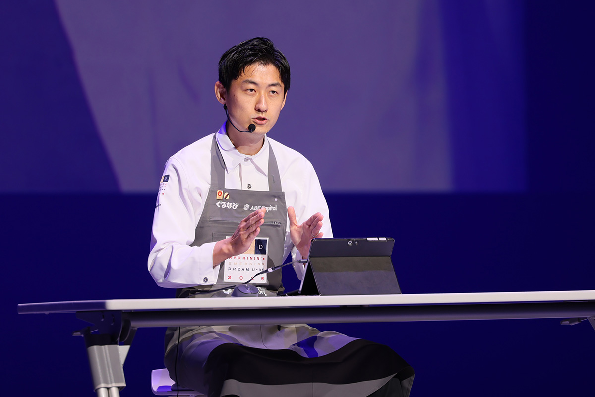会場の注目が集まる中、トップバッターとして登場したのは、佐藤歩氏である。今回のファイナリスト中最年少ではあるが、年齢を感じさせない落ち着いた語り口で「あなたの好きな食べ物は?」と観客に問いかける授業風のプレゼンテーションを展開した。「僕がこのテーマで伝えたいのは、食べることによって作った人もみんな幸せになれるということ。 料理人だけでなく、生産者などさまざまな人たちと繋がりながら、この食べるという行為に幸せを感じることができると、僕は信じている」と、佐藤氏は食べることで広がる“幸せ”について語った。