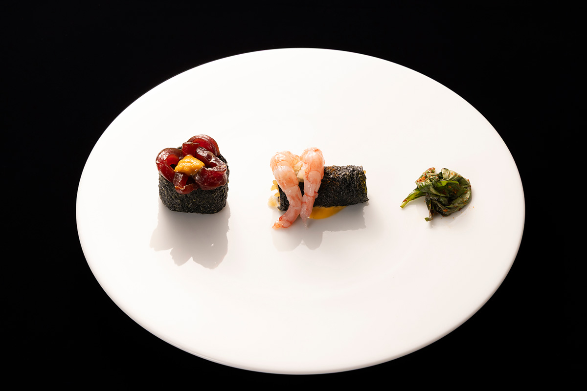 2番手は、トップバッターの李 廷峻氏がオーナーシェフを務める「HASUO」のスーシェフ イ テヒョン氏。「韓国と日本の素晴らしい発酵文化を料理で繋げて、世界へ届けたい」と語るイ氏は、韓国のカンジャンケジャンのタレに漬け込んだマグロの天身にわさびと山椒を忍ばせた軍艦巻きと、甘エビに日本の味噌で風味付けしたビスクリゾット、そしてキムチで爽やかな酸味を添えたキンパを組み合わせた「韓国的軍艦巻きとキンパ」を披露……。しかし、制限時間内に料理が完成することなく審査は終了。イ氏は、厨房を出ることなく戦いを終えた。