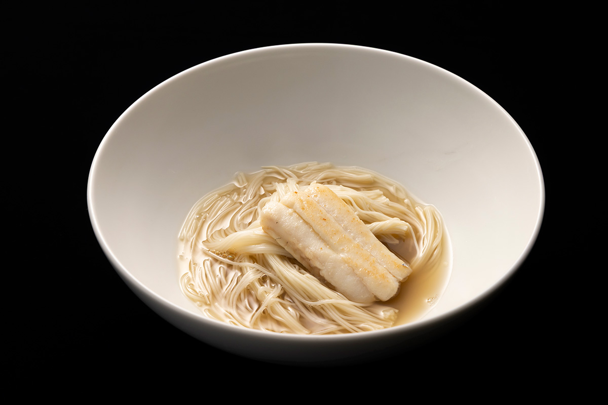 トップバッターとして料理とともに審査室に姿を現したのは、三次審査のグループディスカッションにおいて流暢な日本語はもちろん、優れた思考力を発揮するなど、今大会における注目株の一人だった李 廷峻氏。東京・広尾で韓国の伝統料理をモダンに表現する「HASUO」のオーナーシェフである氏は、韓国の伝統料理「シッケ」を日本流にアレンジした「ミョルチ グクス(煮干しそうめん)」を披露した。スープは水出しの煮干し出汁をベースにさまざまなうまみを抽出したもの。さらに、熟成椎茸で作った自家製醤油で風味づけするなど、韓国流の足し算と、構成要素を絞り込むことで日本料理における引き算の美学を表現した。