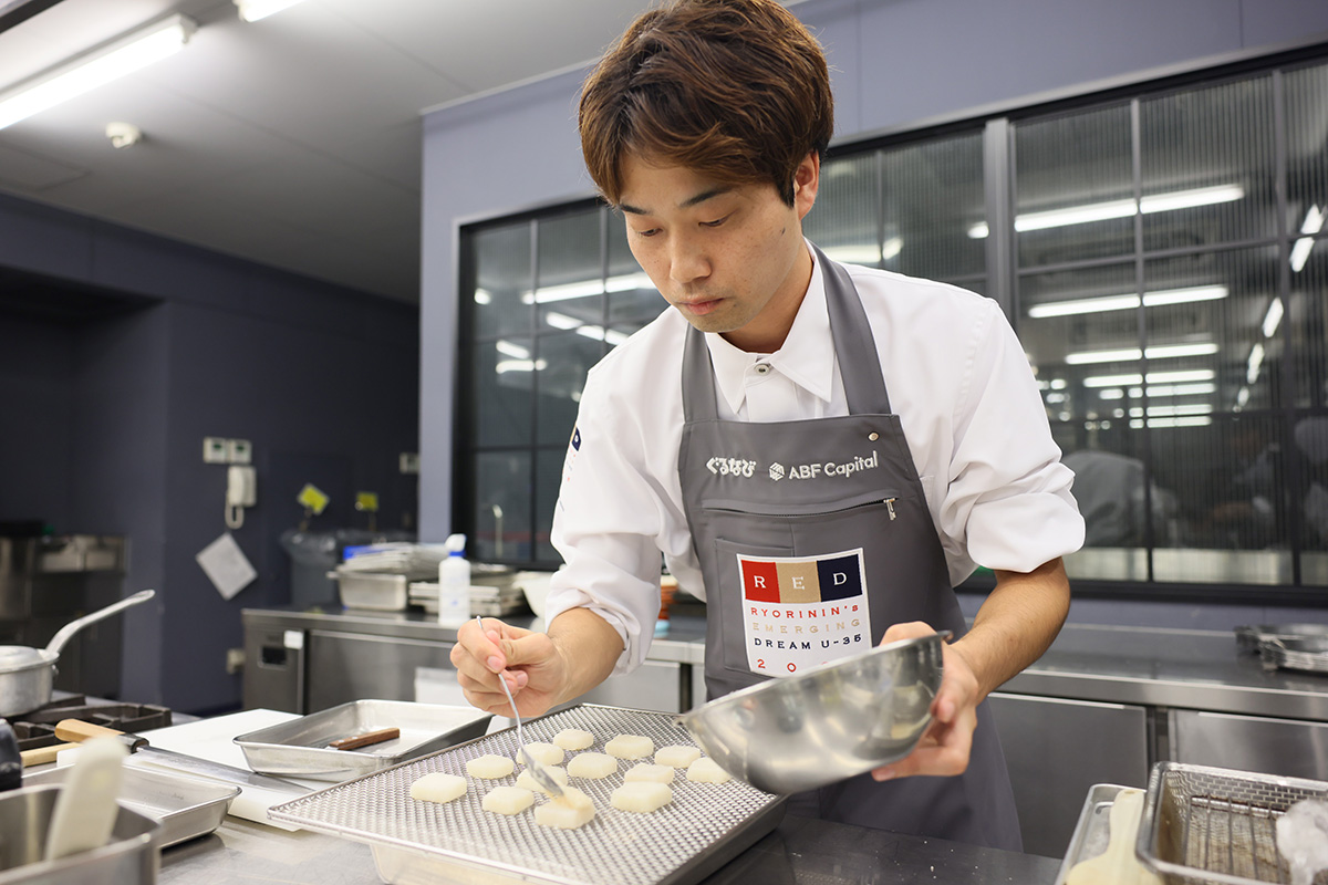 「私たちも本当に楽しみにしているので、みなさんも緊張することなく、楽しんで挑んでください」――緊張の面持ちで審査を待つ彼らは、審査員長の狐野扶実子氏の激励に奮い立ったかのように、各自準備を開始。一人目の挑戦者から厨房に移動し、試食審査がスタートした。