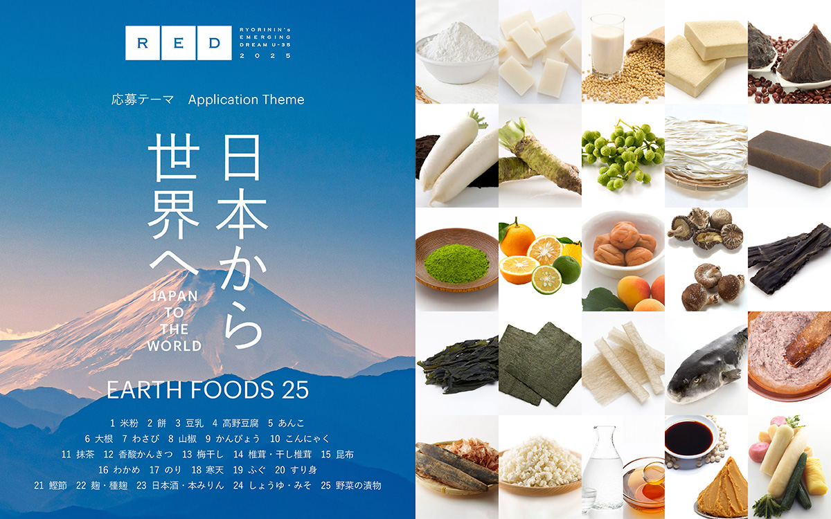11人目のグランプリRED EGG(2019年大会は該当者なし)の称号を獲得すべく、若き料理人が挑んだ一次審査の課題は、「日本から世界へ」をテーマに「EARTH FOODS 25」を使った料理と文章で自らのビジョンを表現すること。「EARTH FOODS 25」とは、食の未来をより良いものにするために、世界に広く共有したい日本発の食のリスト。米粉や豆乳、高野豆腐、山葵、山椒、干瓢など、日本の気候・風土によって育まれた独自の食文化を象徴する食材である。その価値と本質を再定義し、レシピとして広めることで、食文化のさらなる発展や、環境問題などさまざまな課題解決への貢献が目指された難題である。