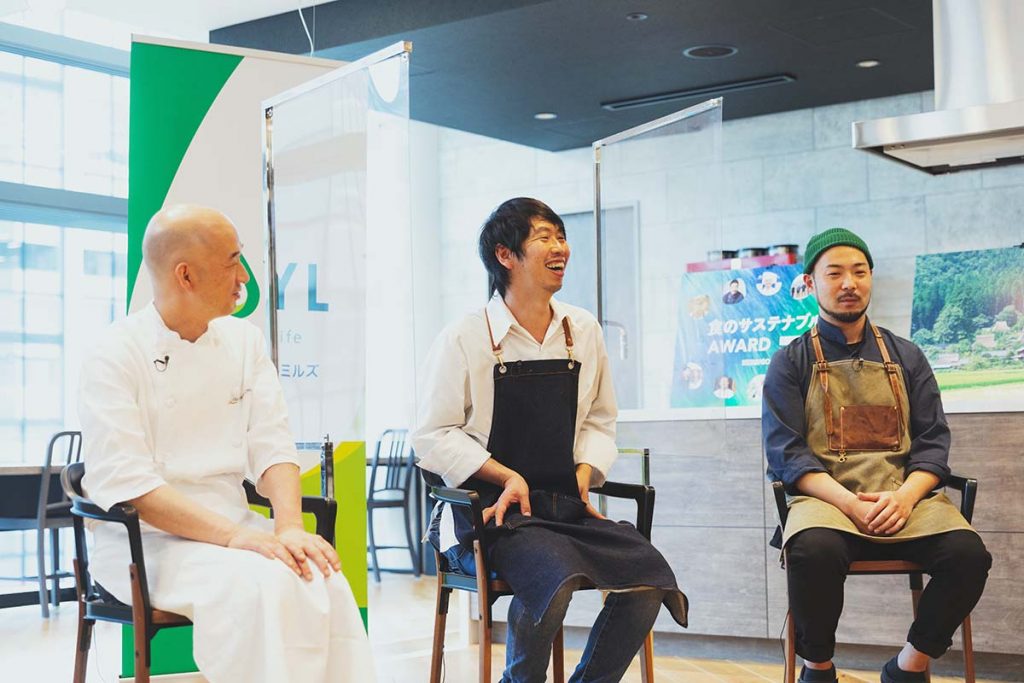 試食会後、受賞3組への授賞セレモニーを挟み、アフターミーティングはいよいよ座談会へ。狐野氏がファシリテーターを務め、改めて食のサステナブルの意義を語り合った。