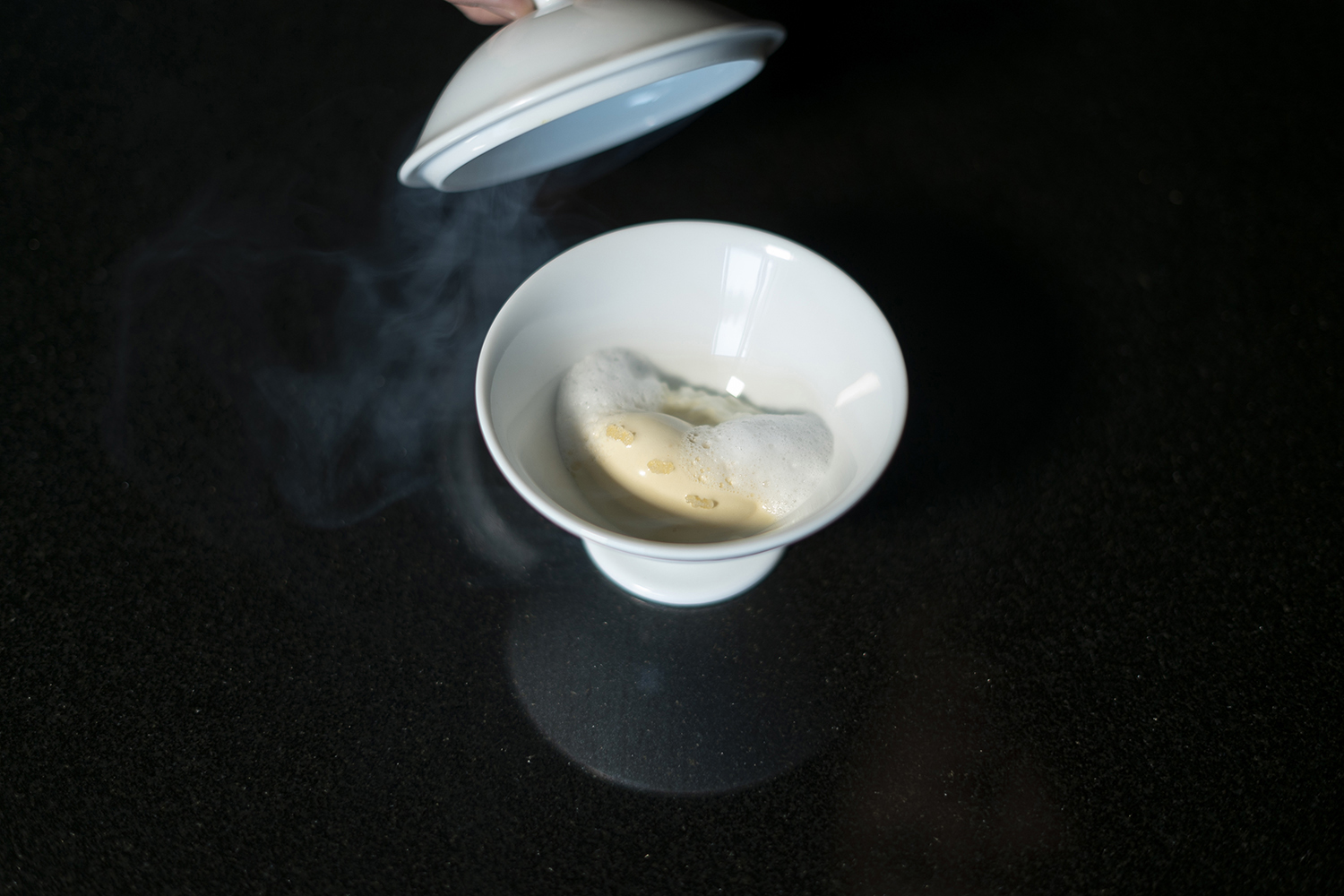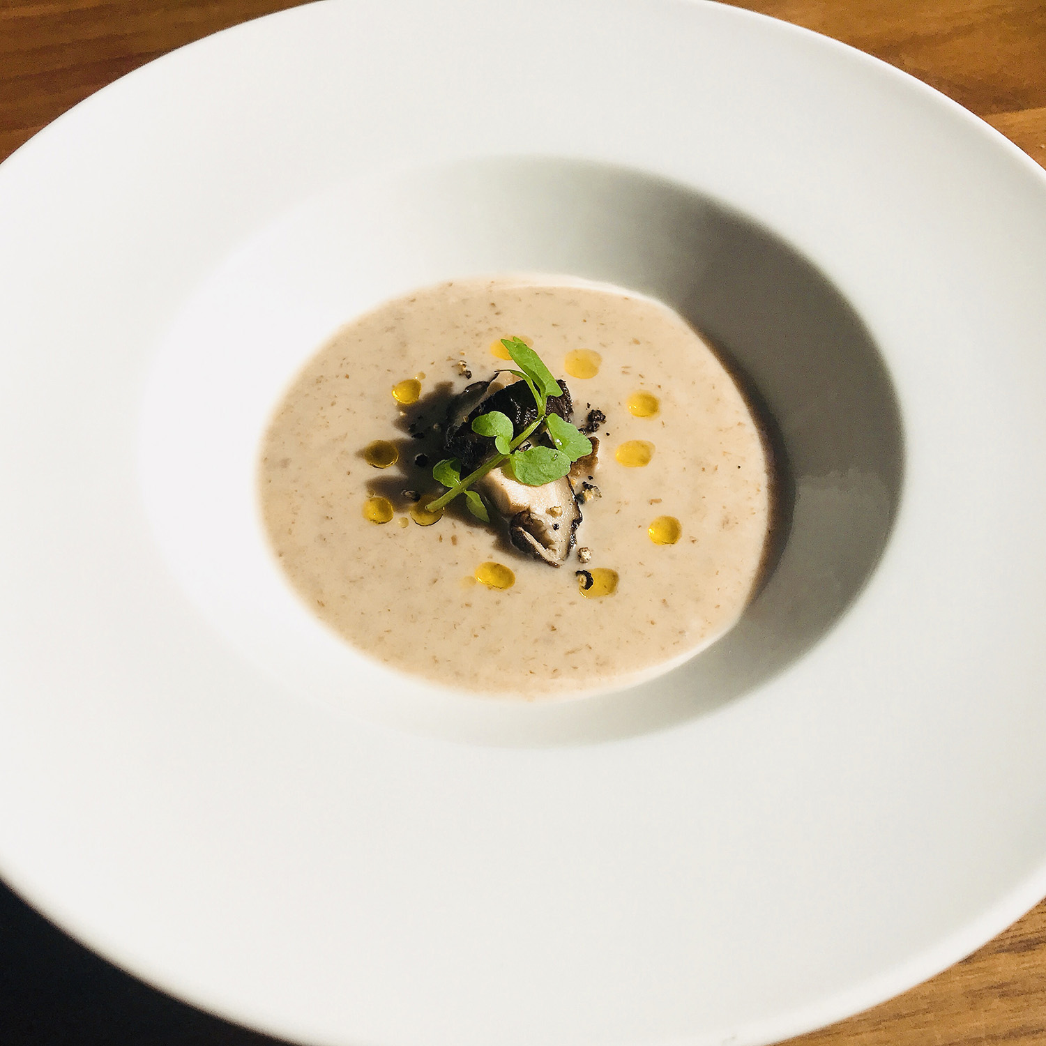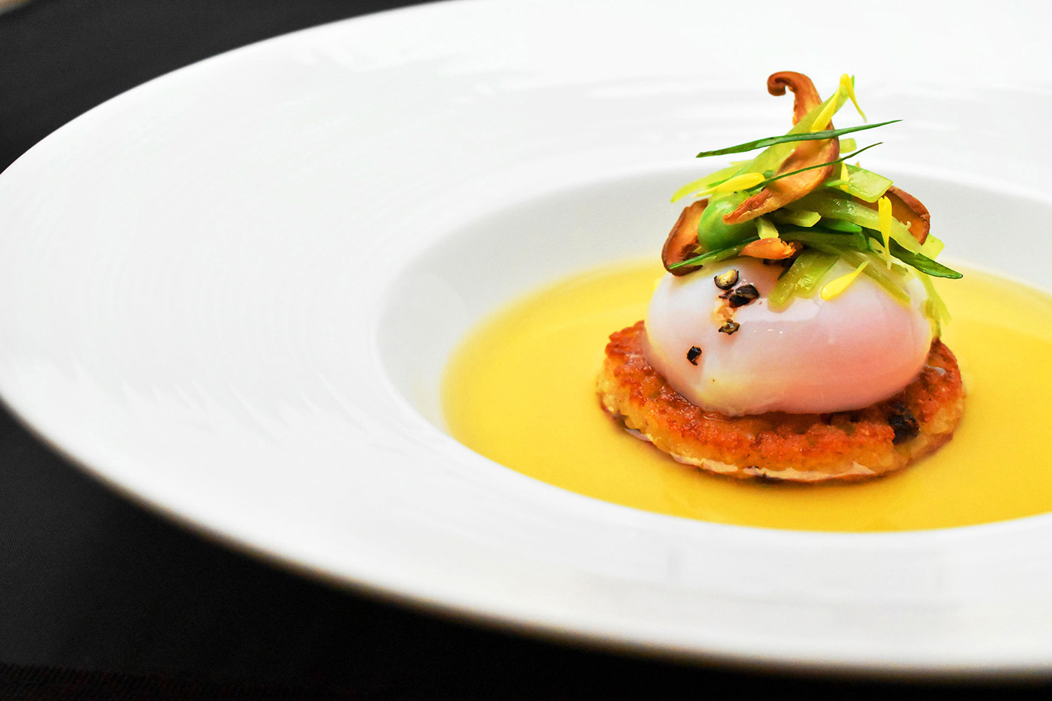 料理名:丹波地鶏と生椎茸のコンソメ 砂肝の焼きリゾットと温泉卵と共に 母の雑煮のイメージで