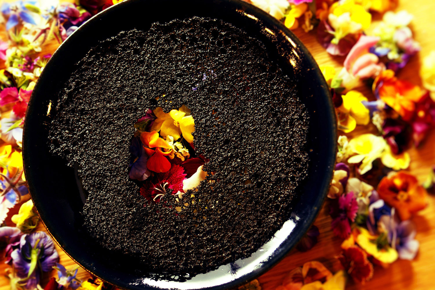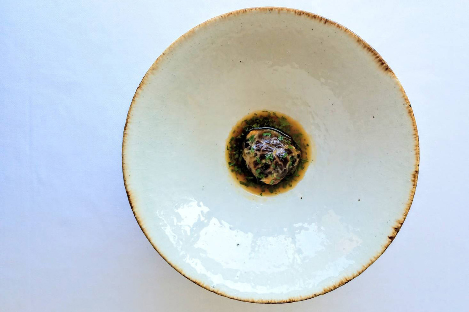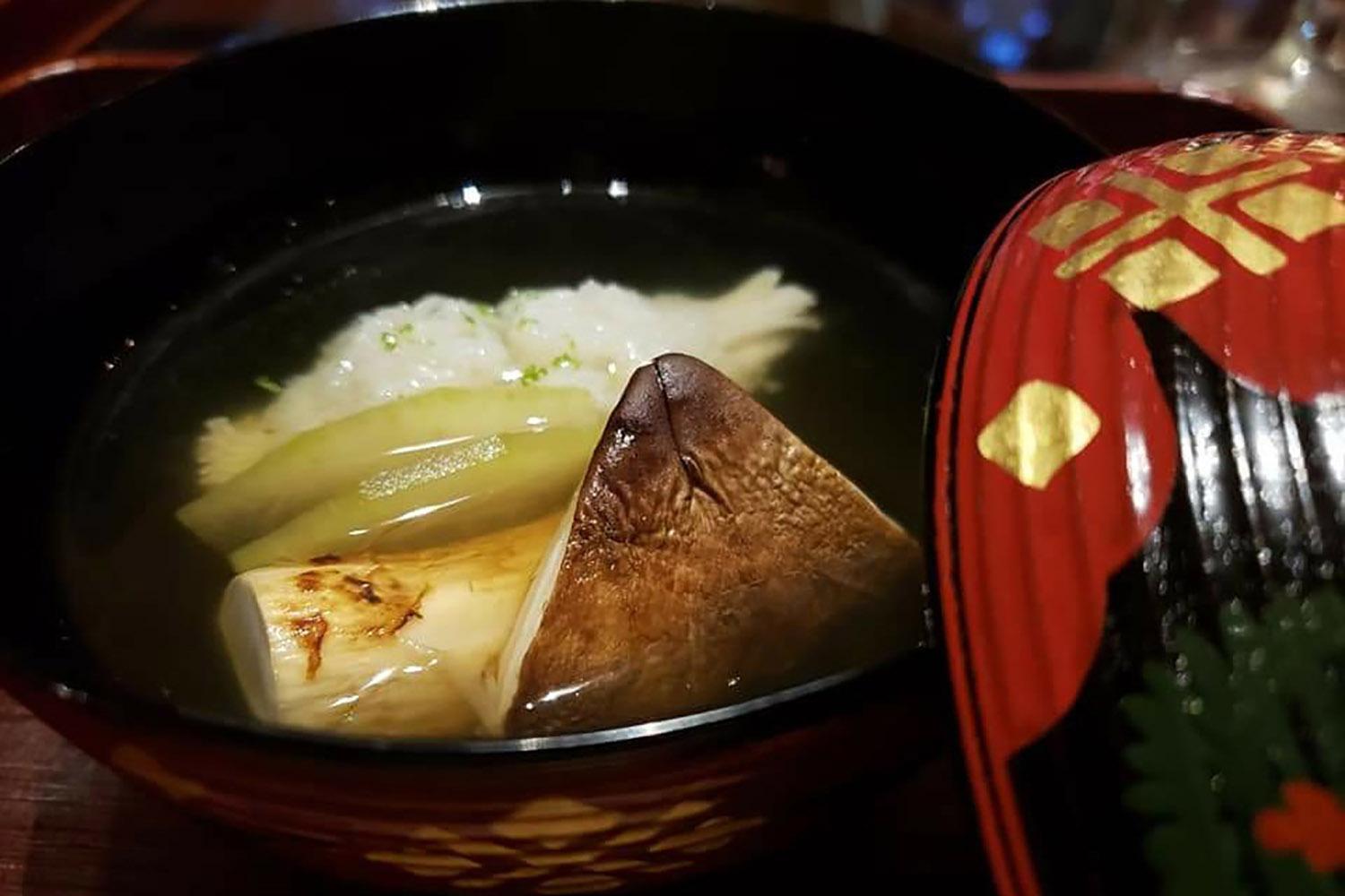 料理名:丹波地鶏と生椎茸のコンソメ 砂肝の焼きリゾットと温泉卵と共に 母の雑煮のイメージで