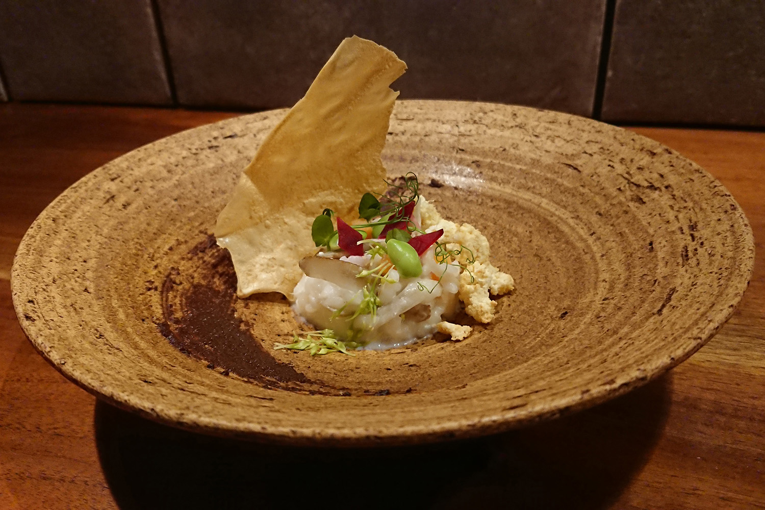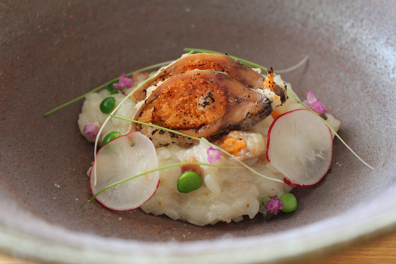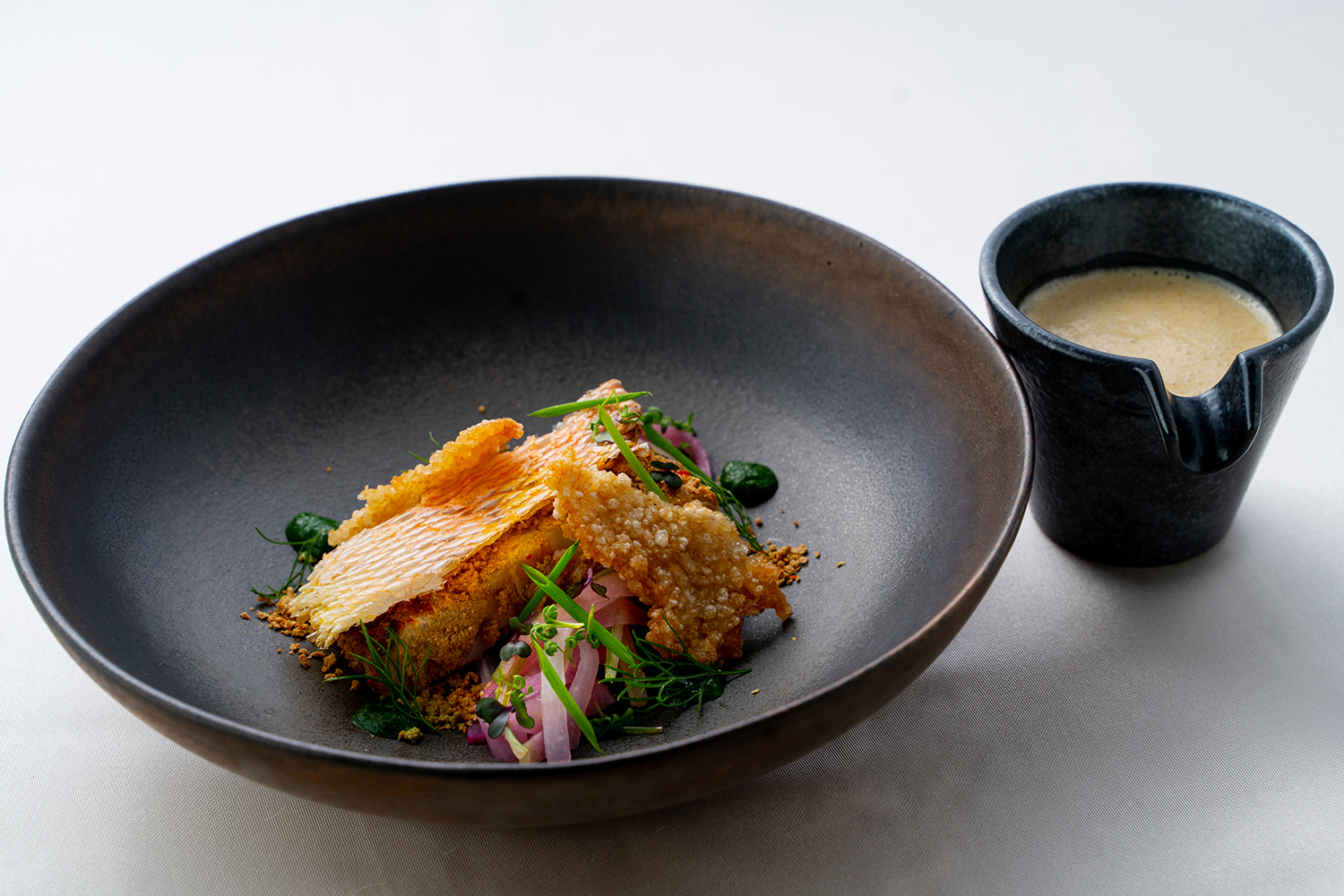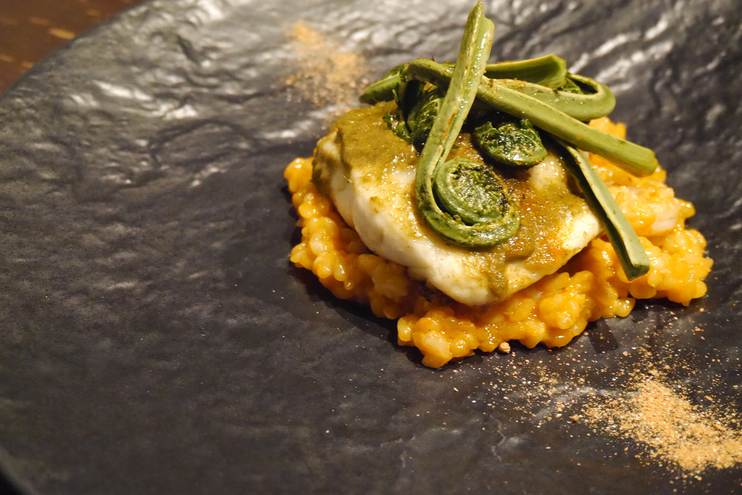料理名:黒鯛のポワレ 蕗味噌のラッケ 甘エビの濃厚なリゾットと