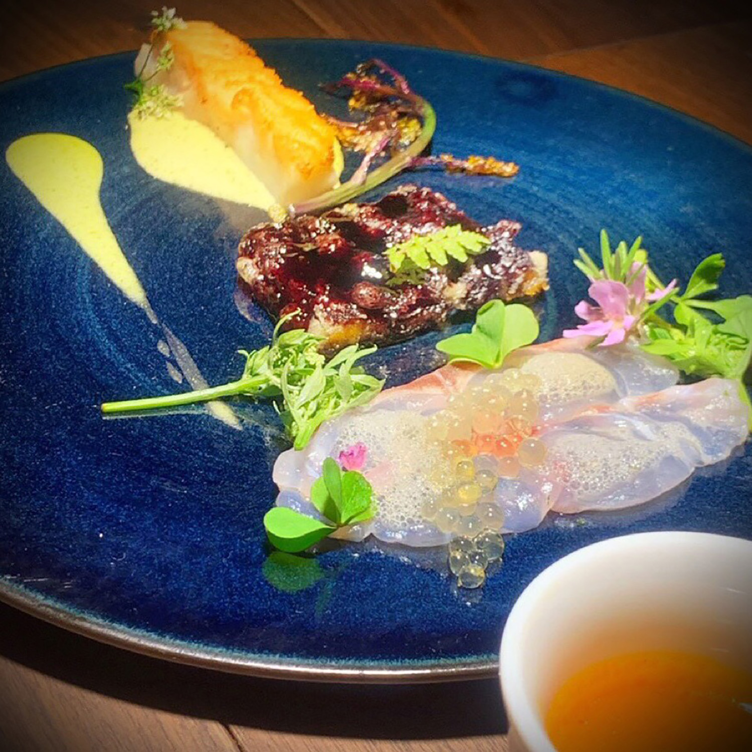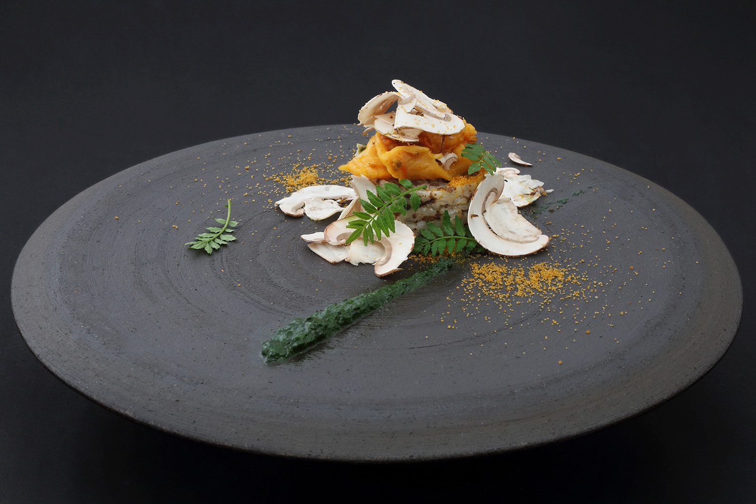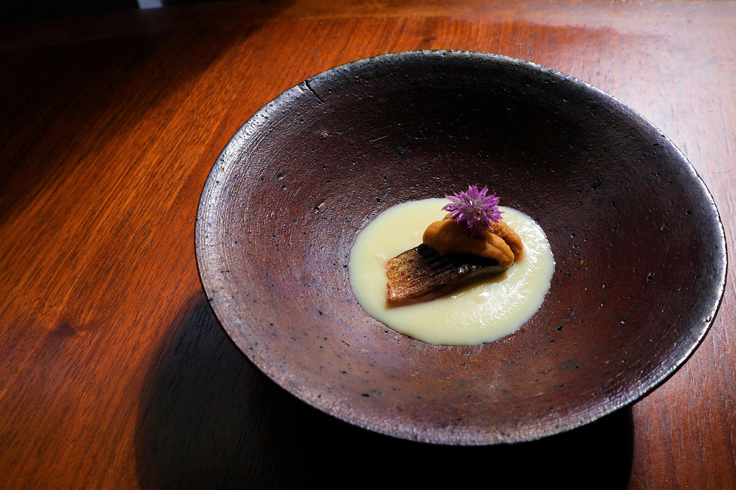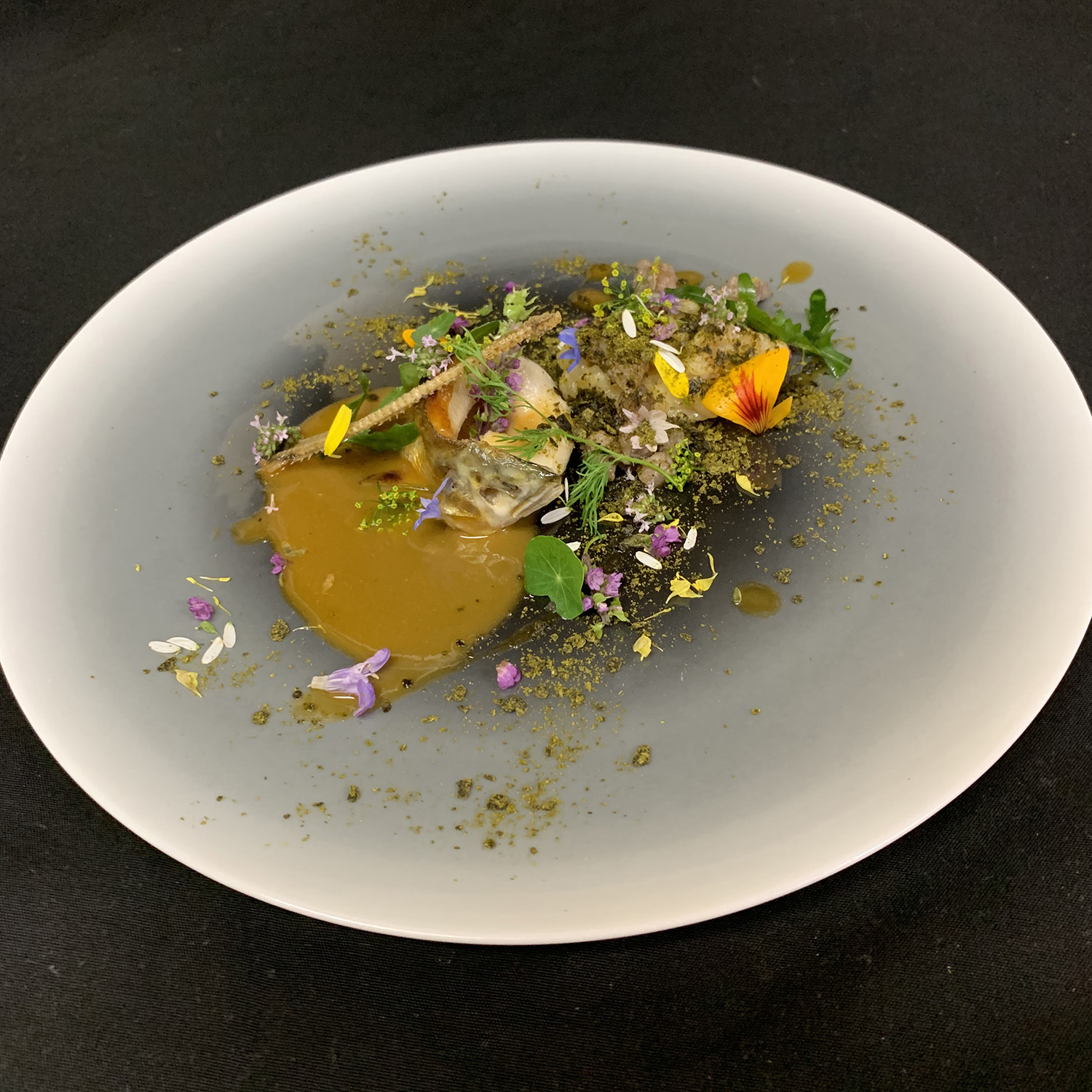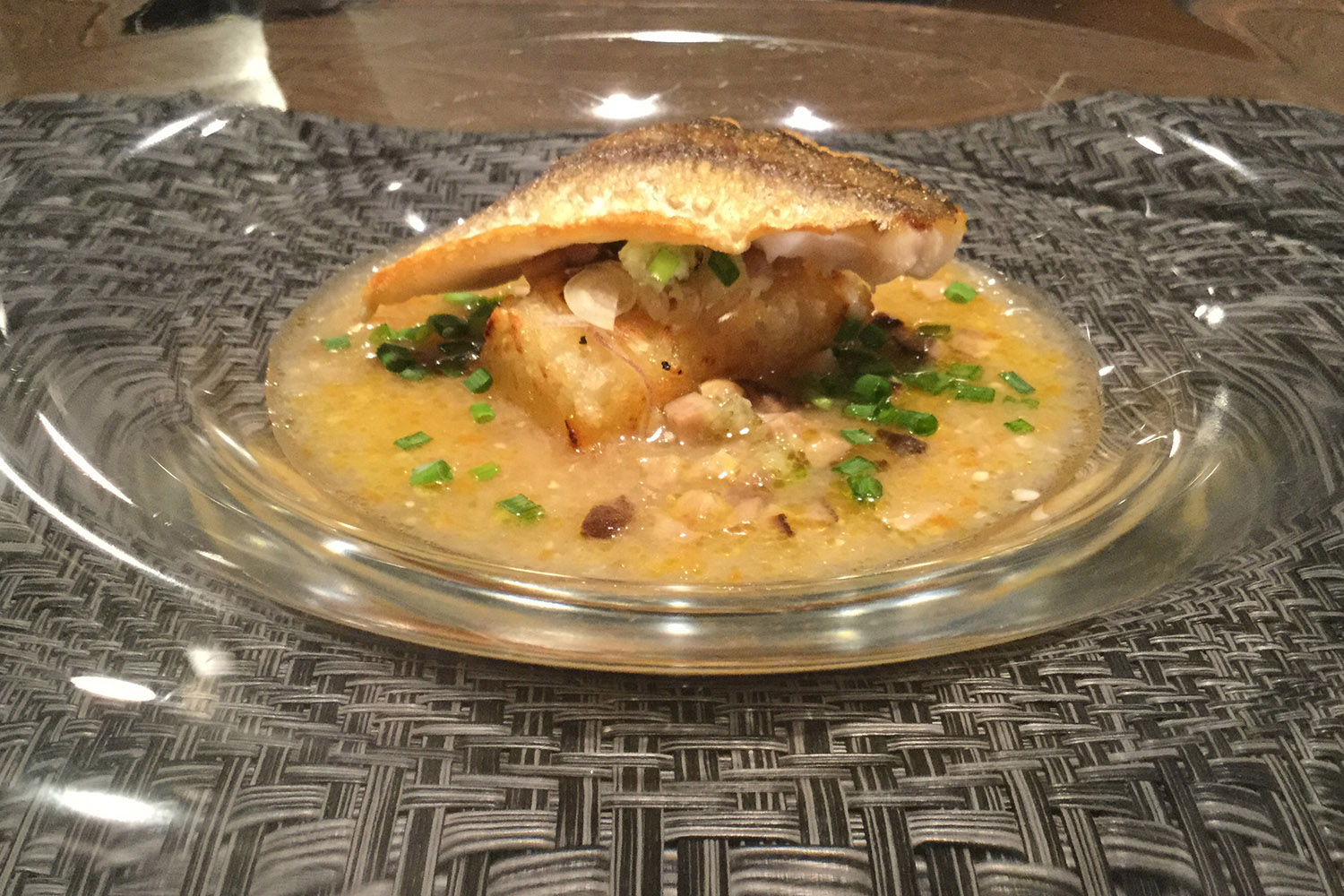 料理名:黒鯛のポワレ 蕗味噌のラッケ 甘エビの濃厚なリゾットと