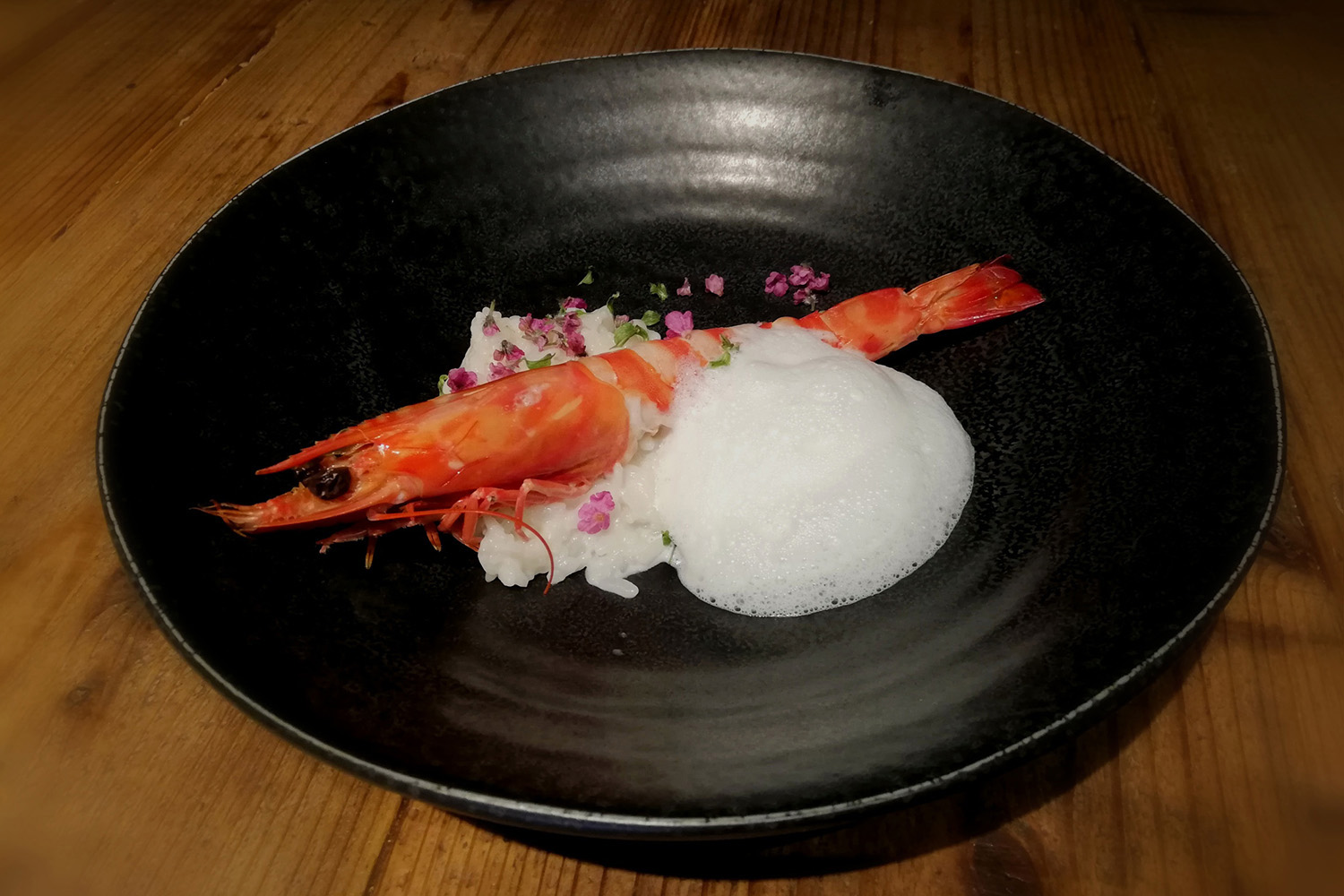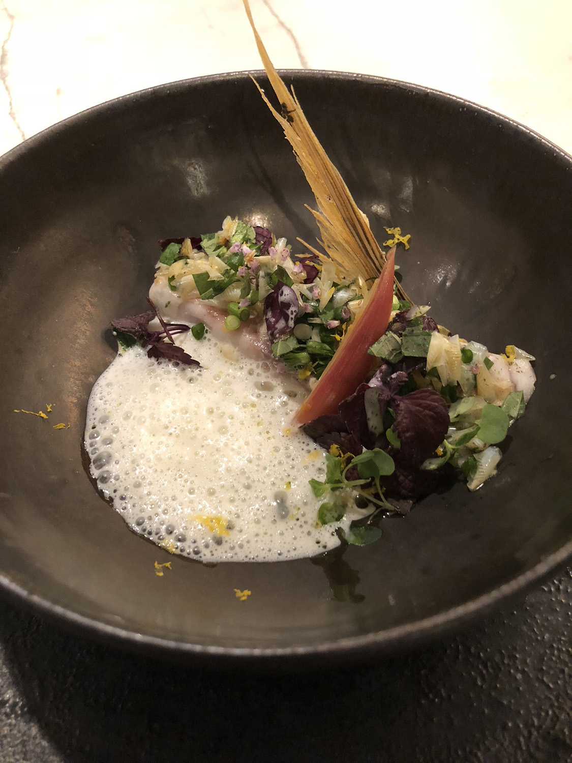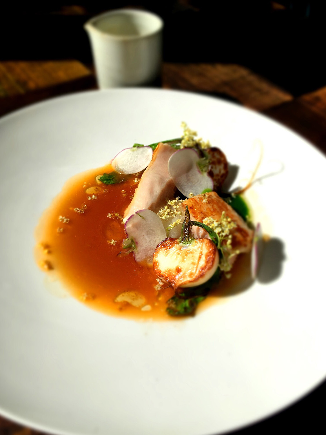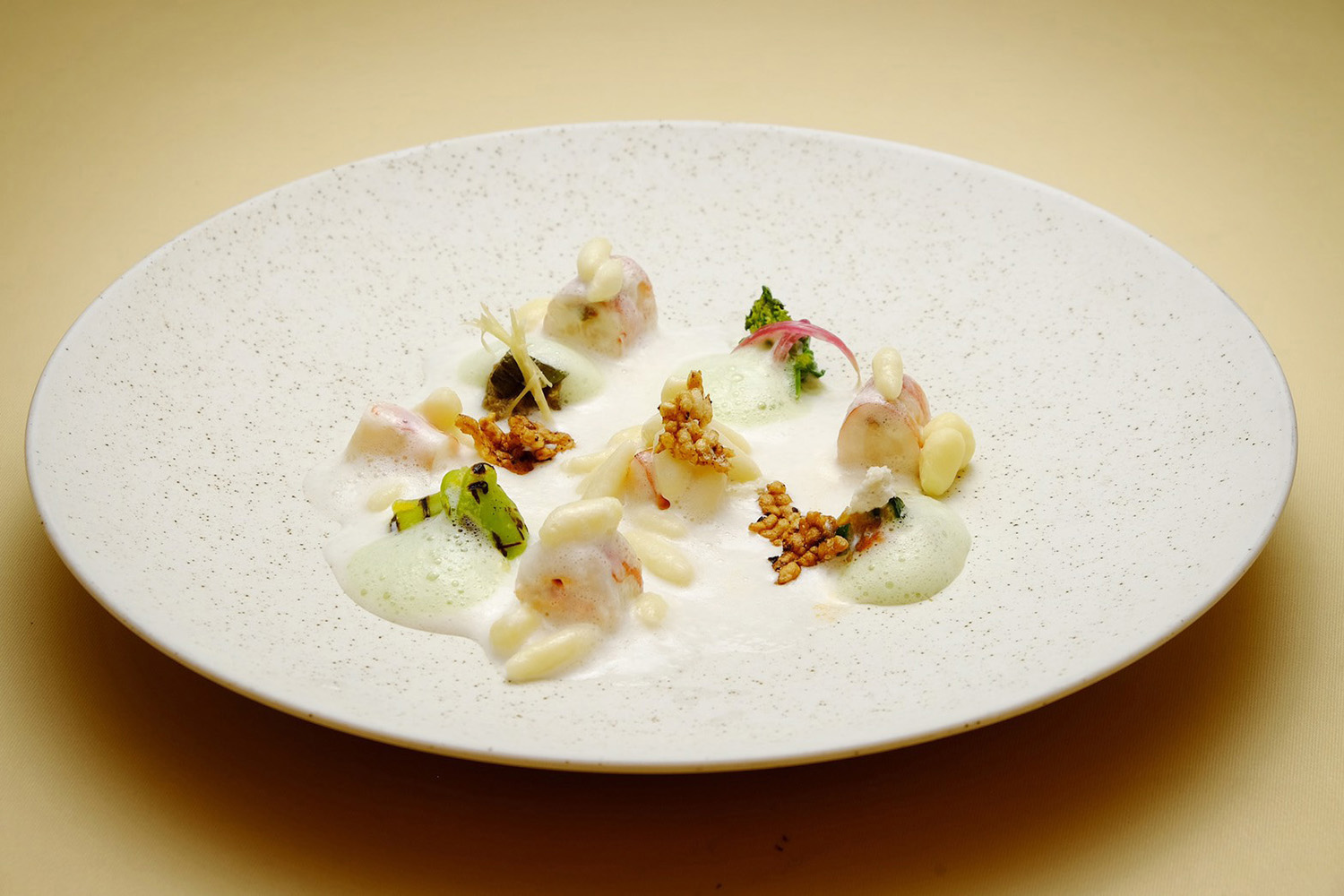 料理名:黒鯛のポワレ 蕗味噌のラッケ 甘エビの濃厚なリゾットと