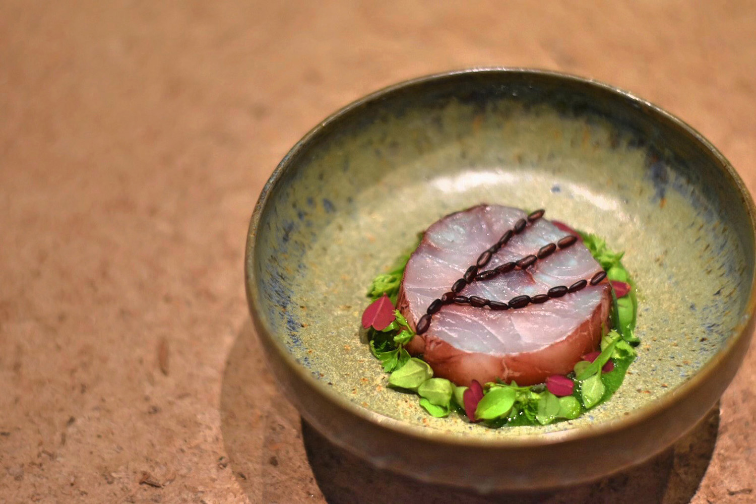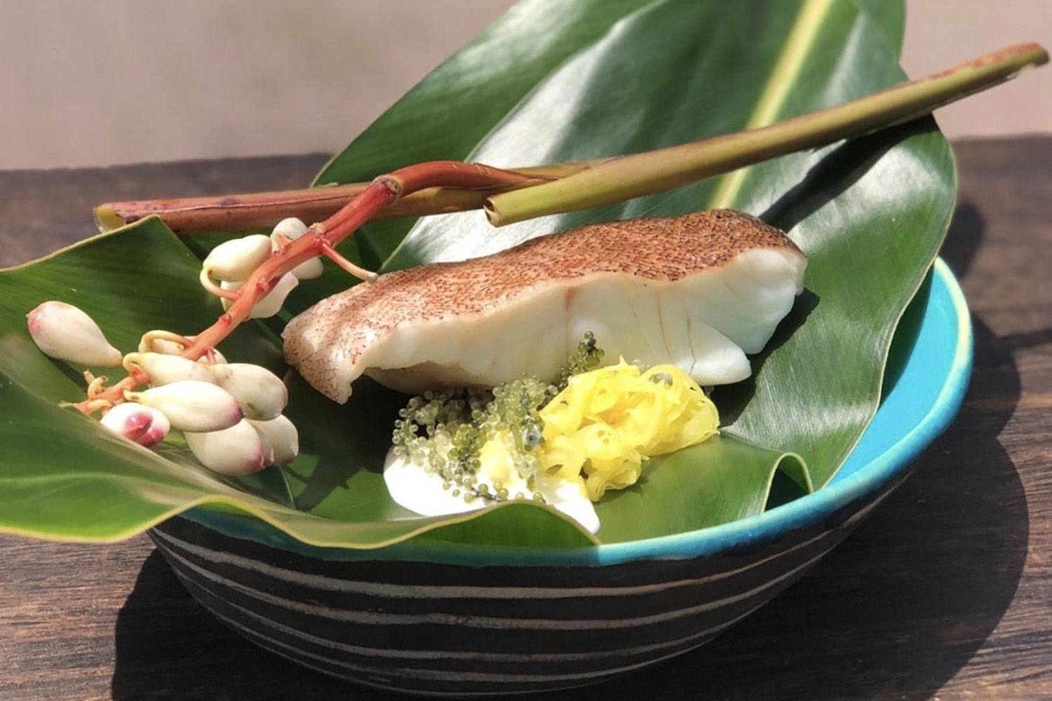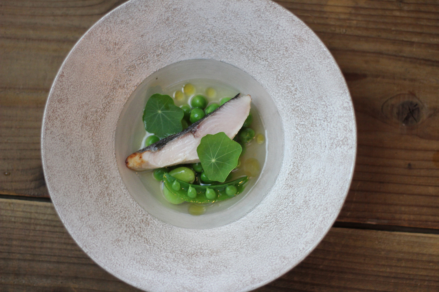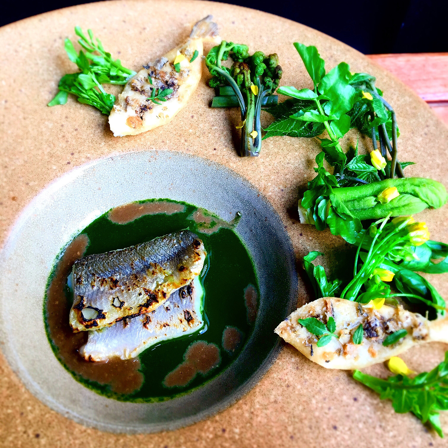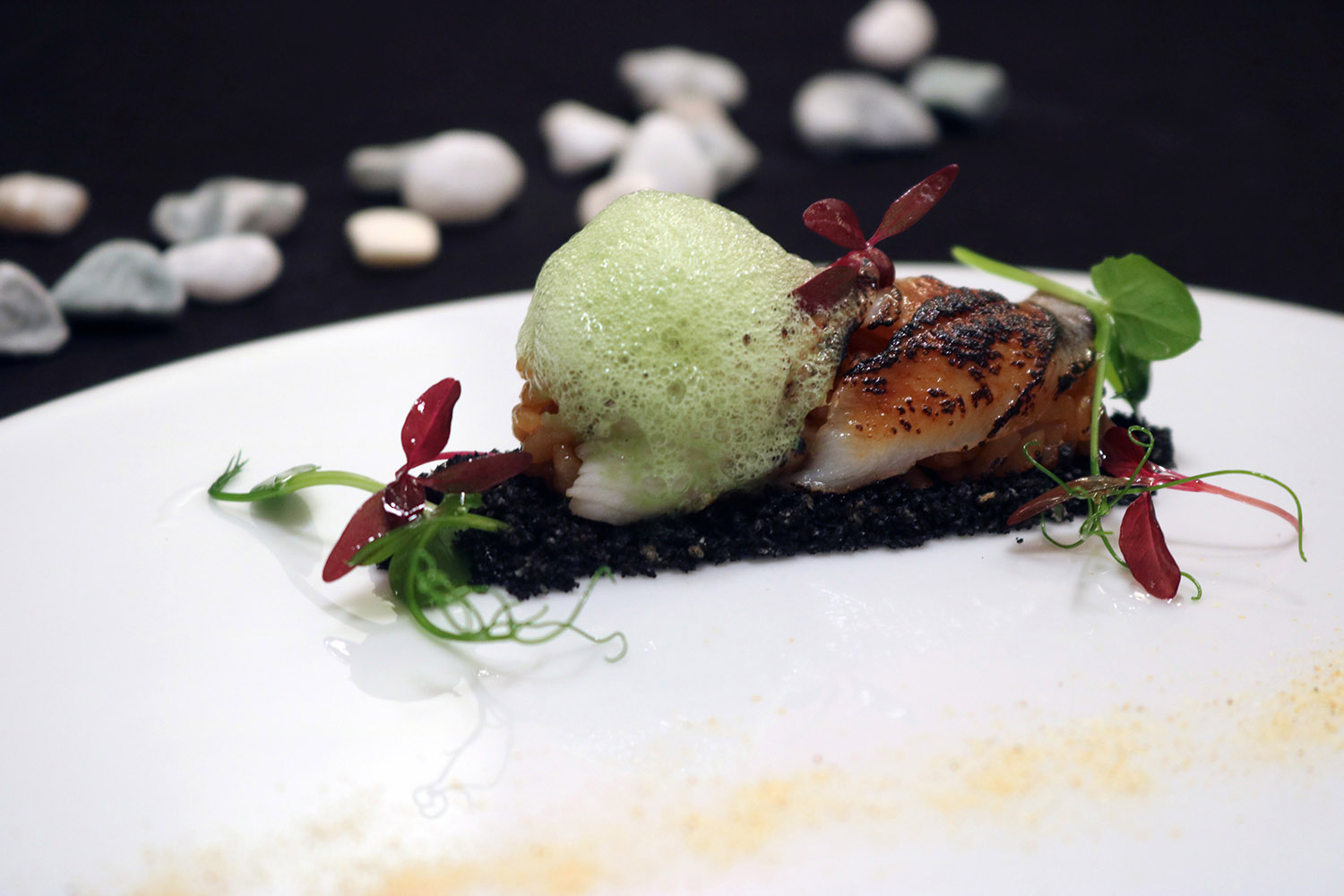 料理名:黒鯛のポワレ 蕗味噌のラッケ 甘エビの濃厚なリゾットと