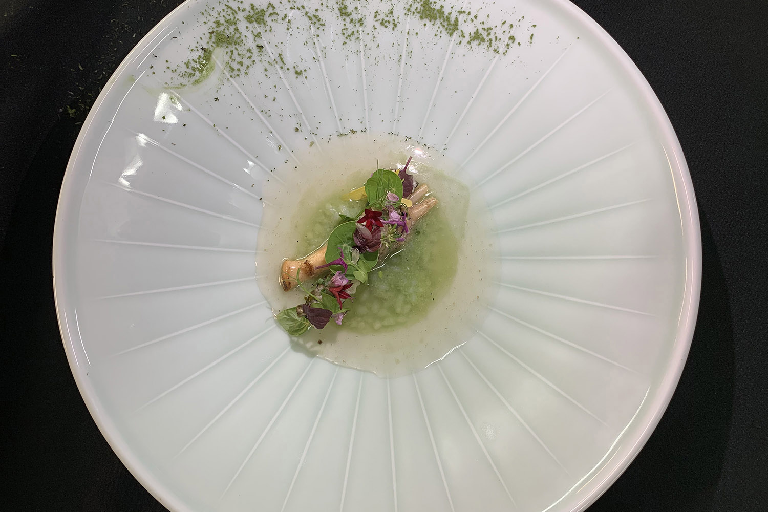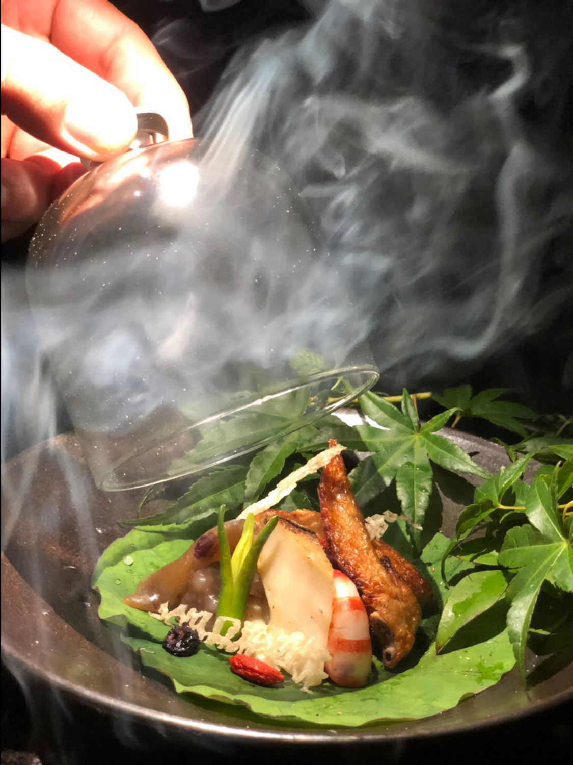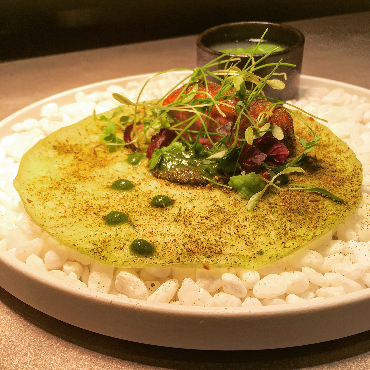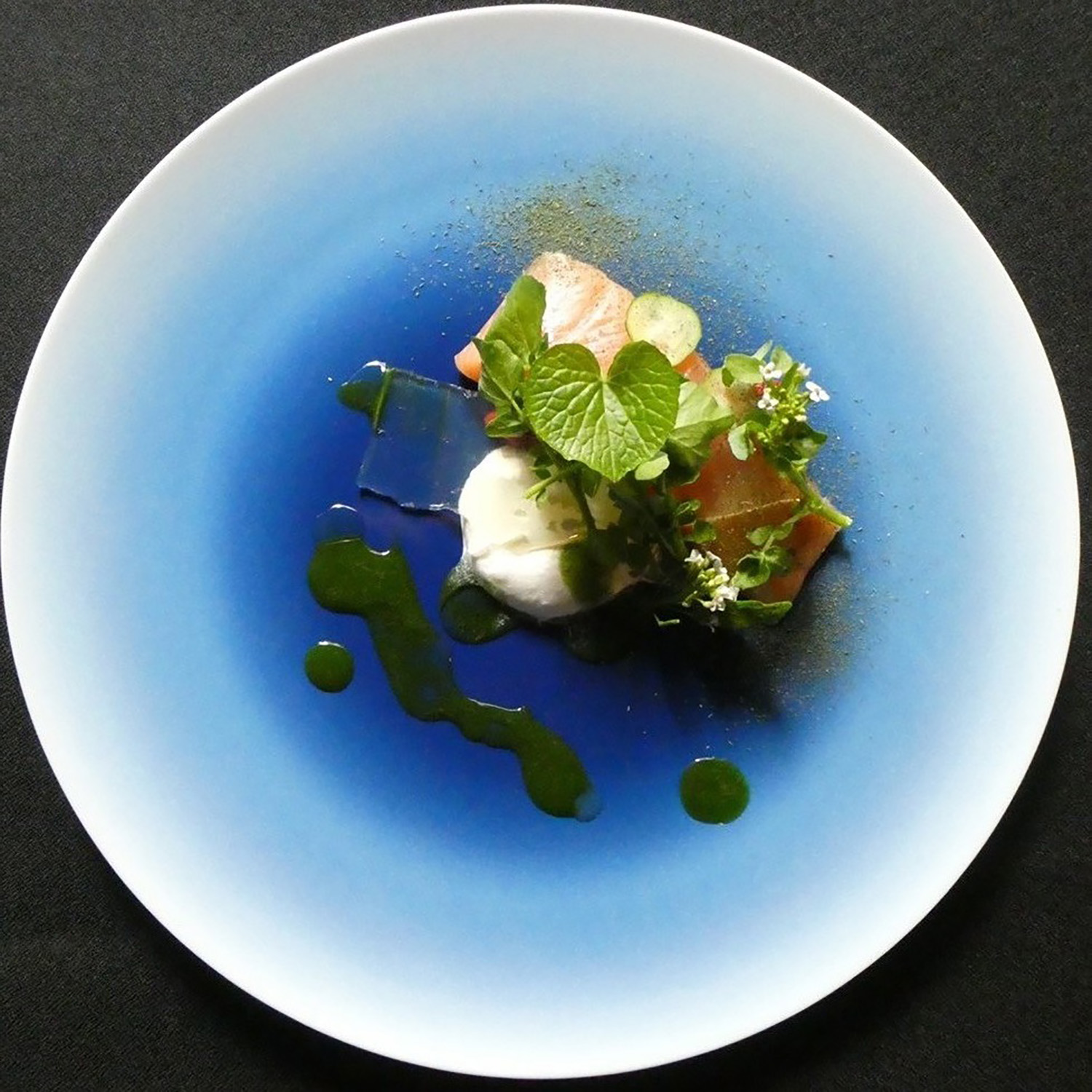 料理名:和製ダック 日本庭園仕立て(初夏) 但馬産鴨とニラの薄餅 瓜とジャスミン茶のガスパチョ