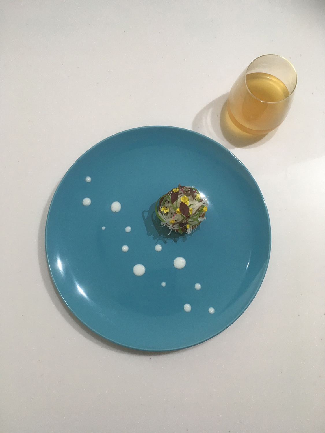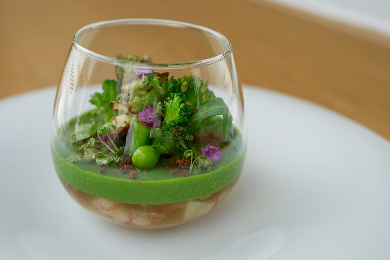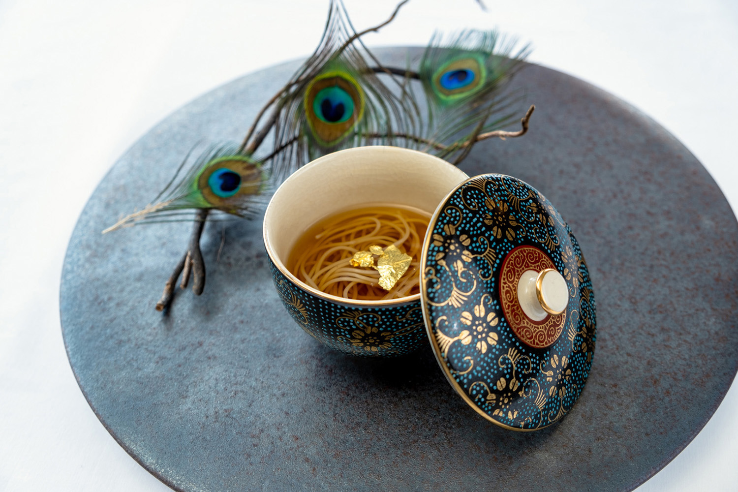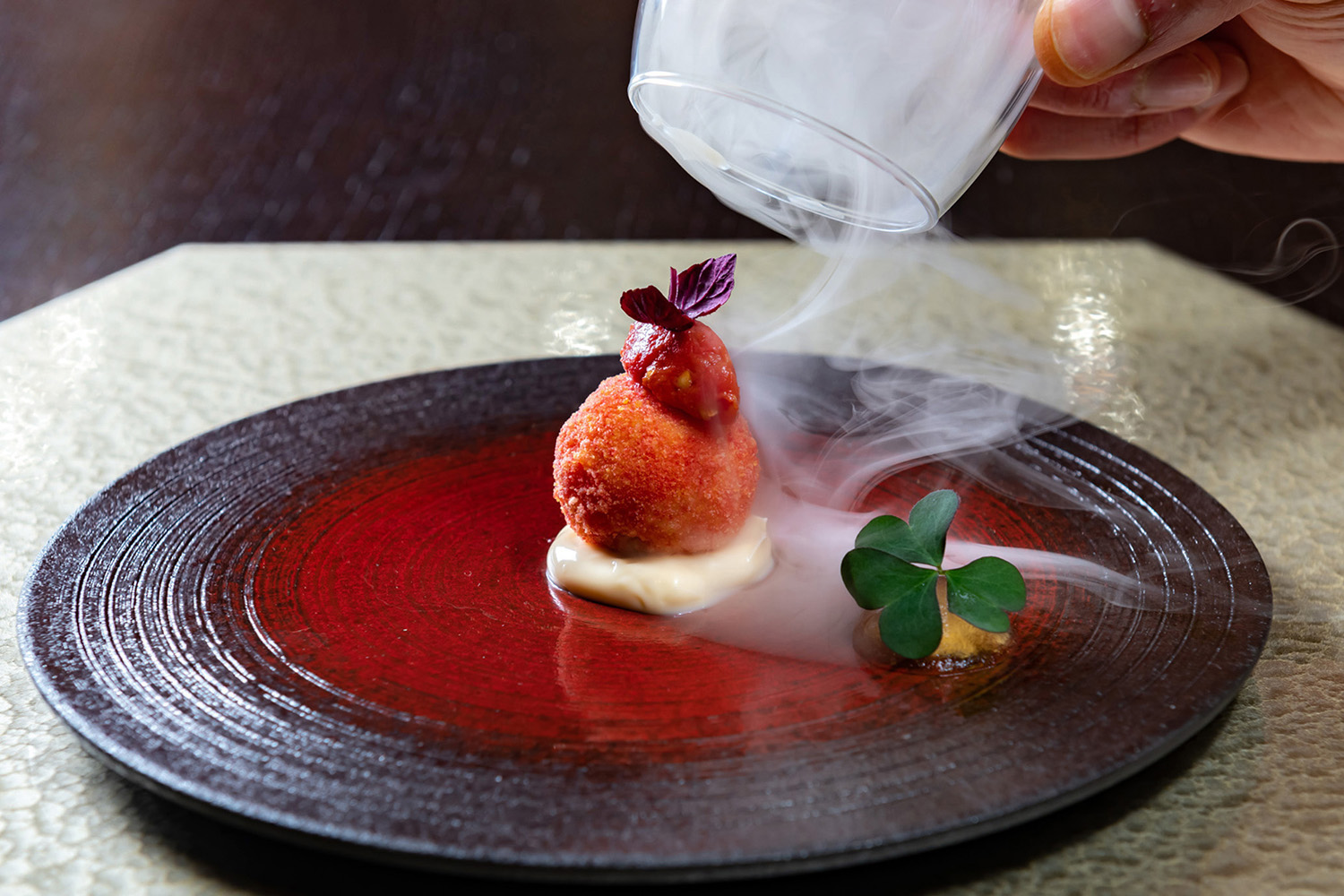 料理名:和製ダック 日本庭園仕立て(初夏) 但馬産鴨とニラの薄餅 瓜とジャスミン茶のガスパチョ