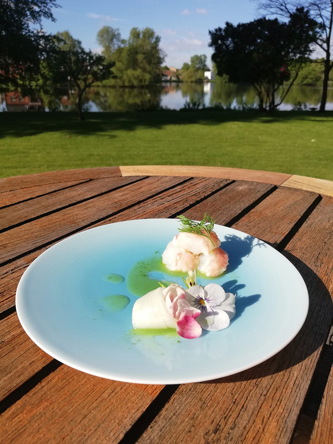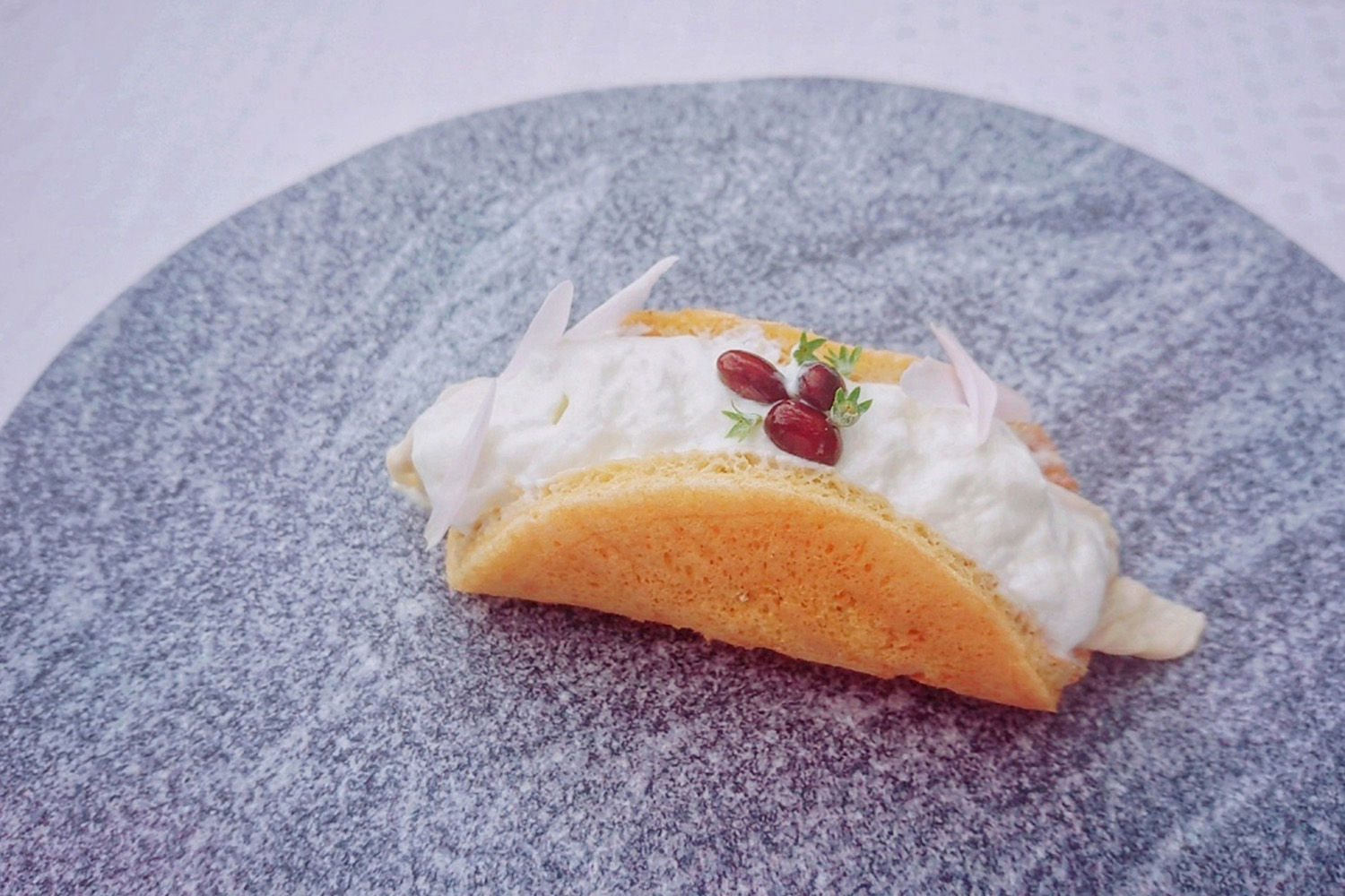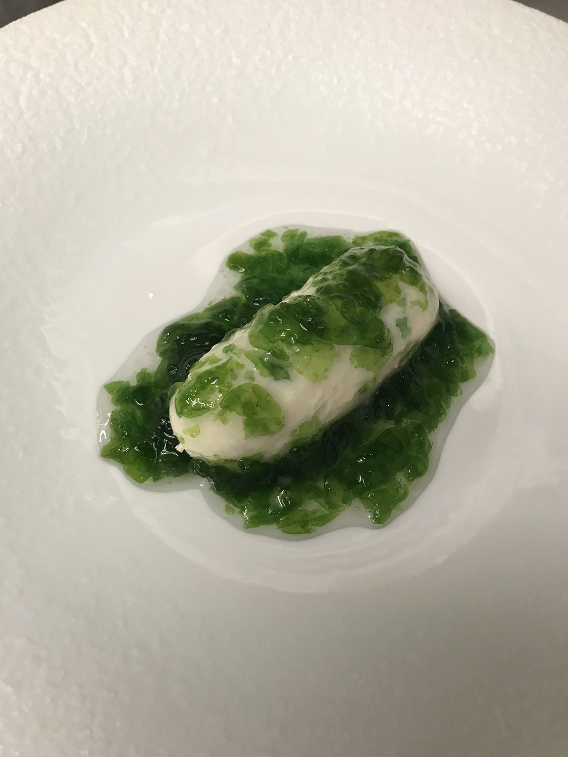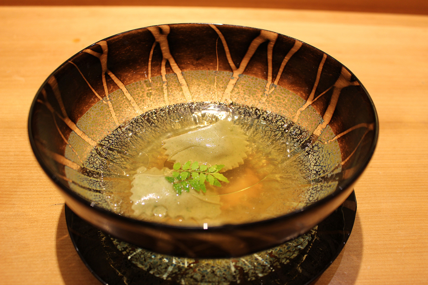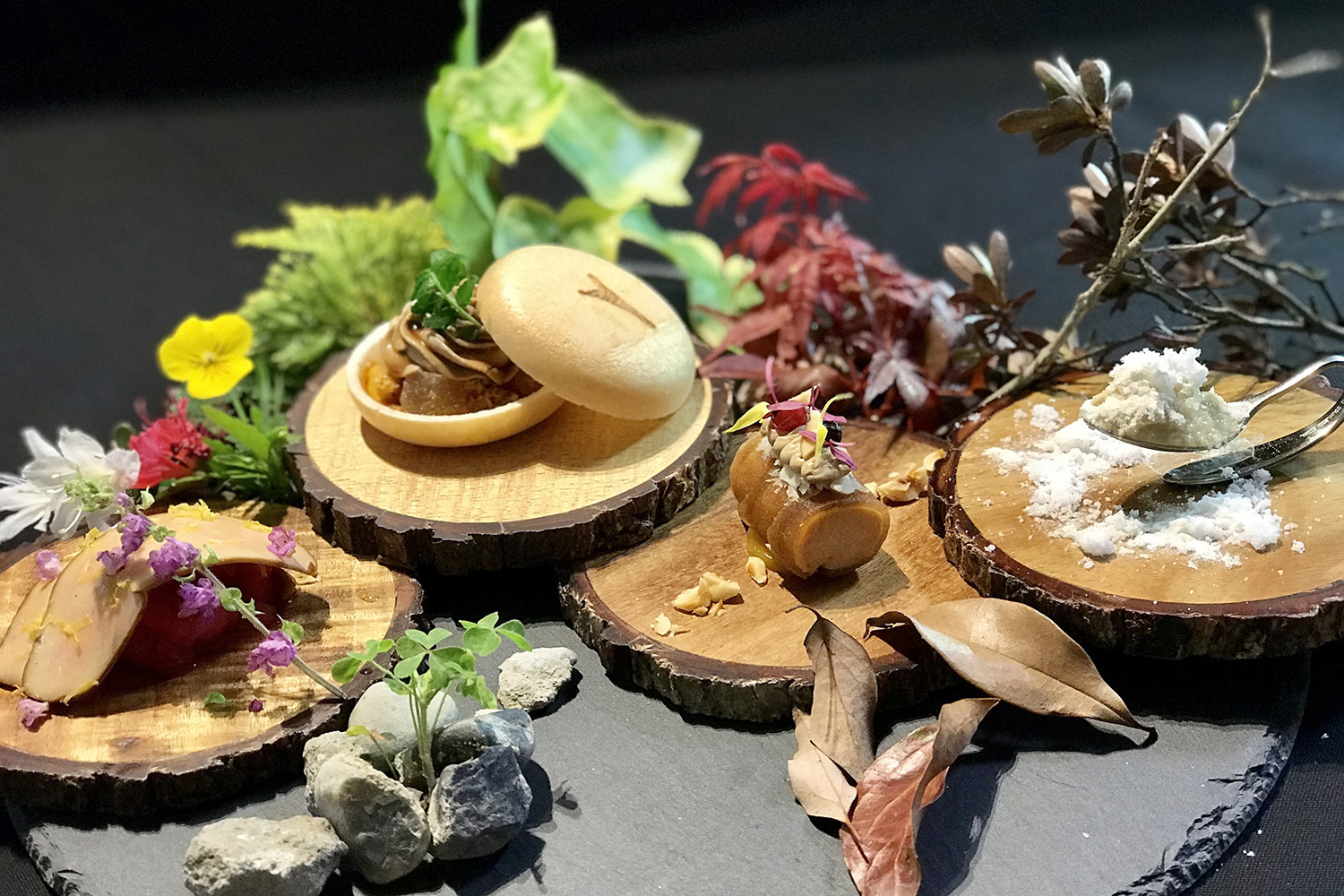 料理名:和製ダック 日本庭園仕立て(初夏) 但馬産鴨とニラの薄餅 瓜とジャスミン茶のガスパチョ