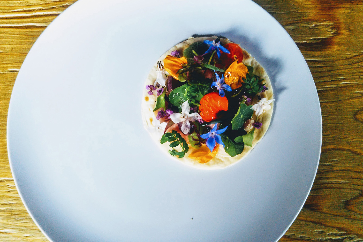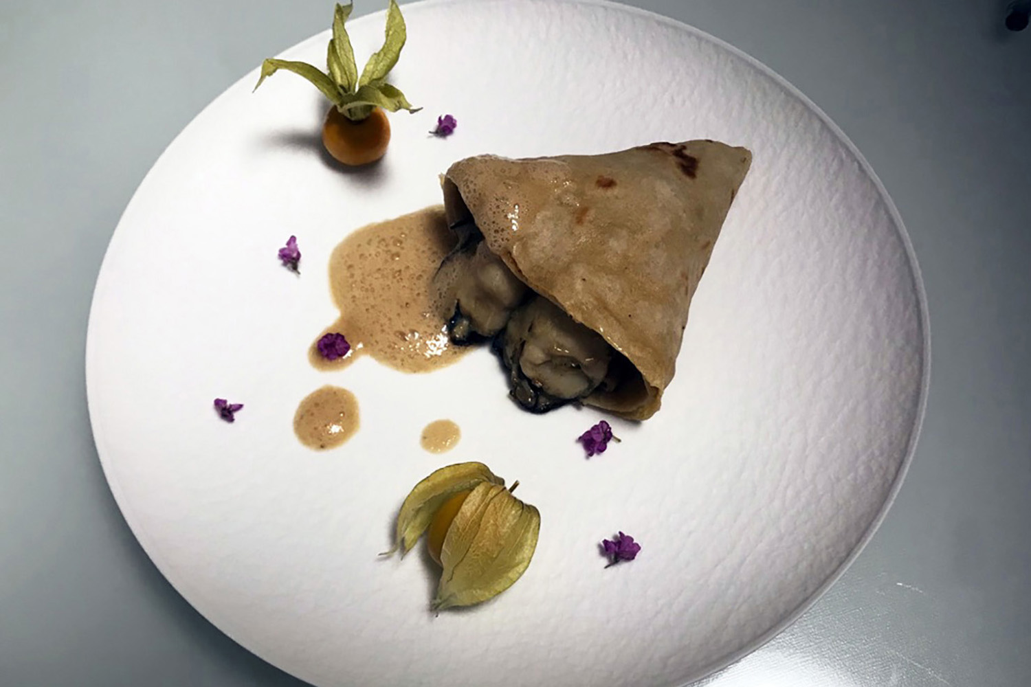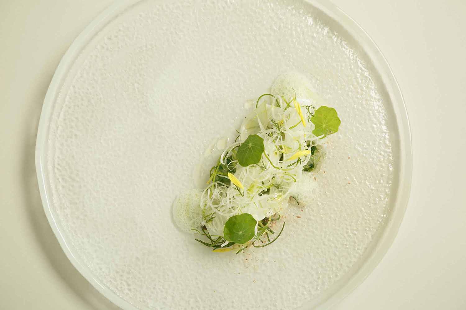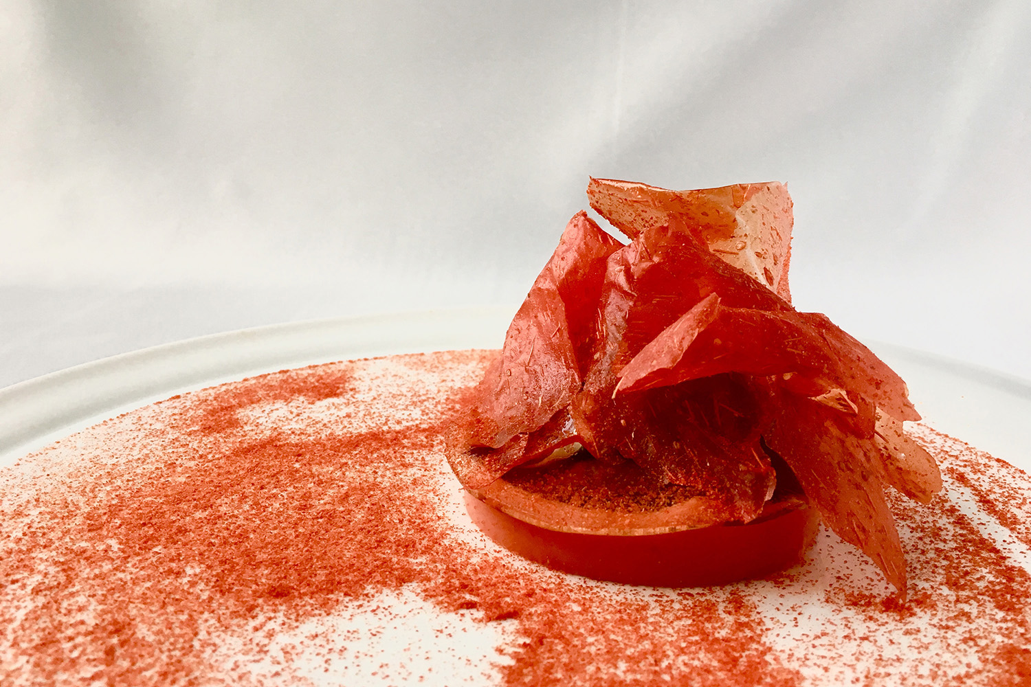 料理名:和製ダック 日本庭園仕立て(初夏) 但馬産鴨とニラの薄餅 瓜とジャスミン茶のガスパチョ