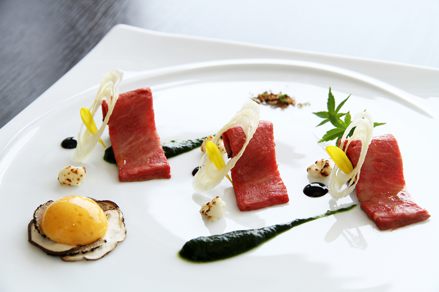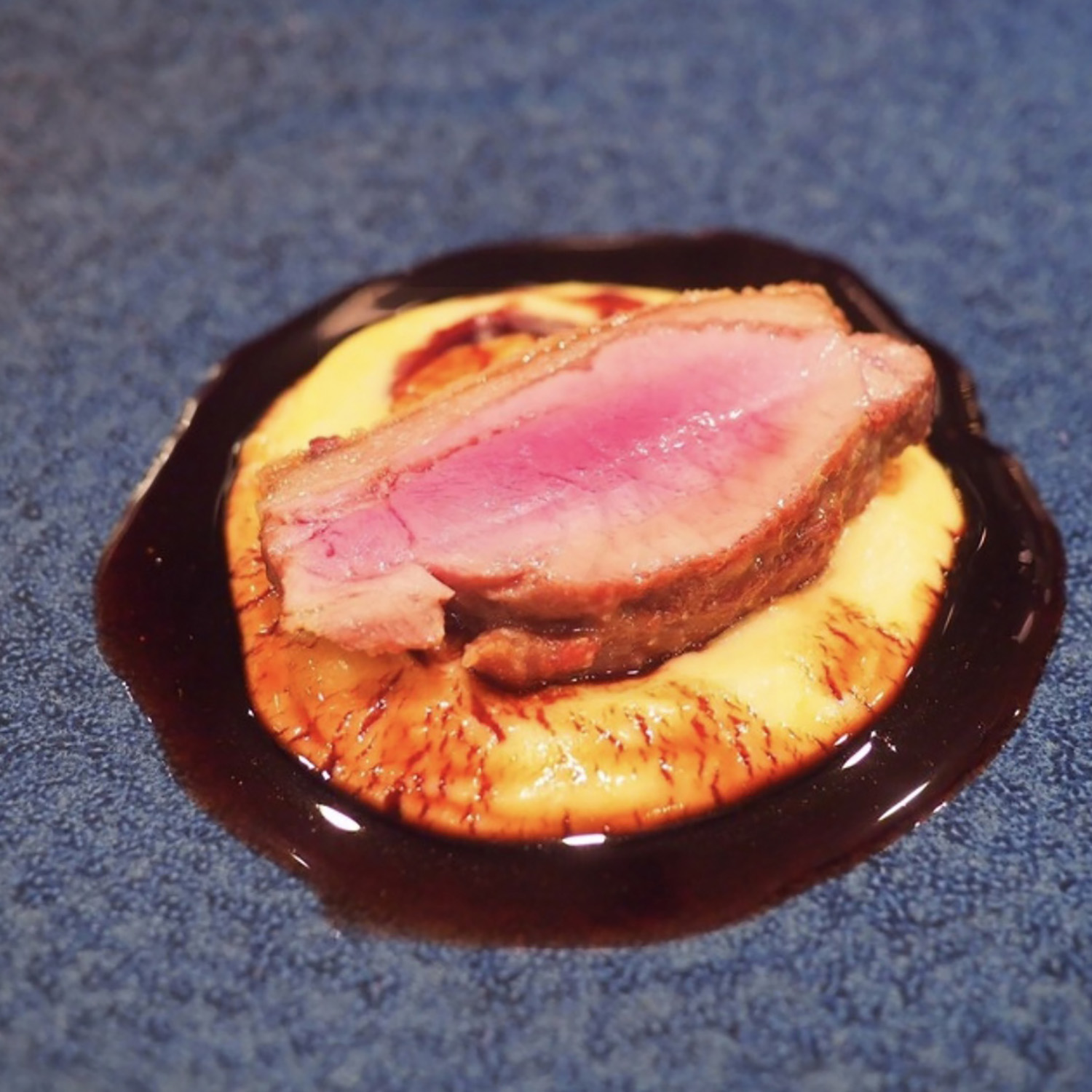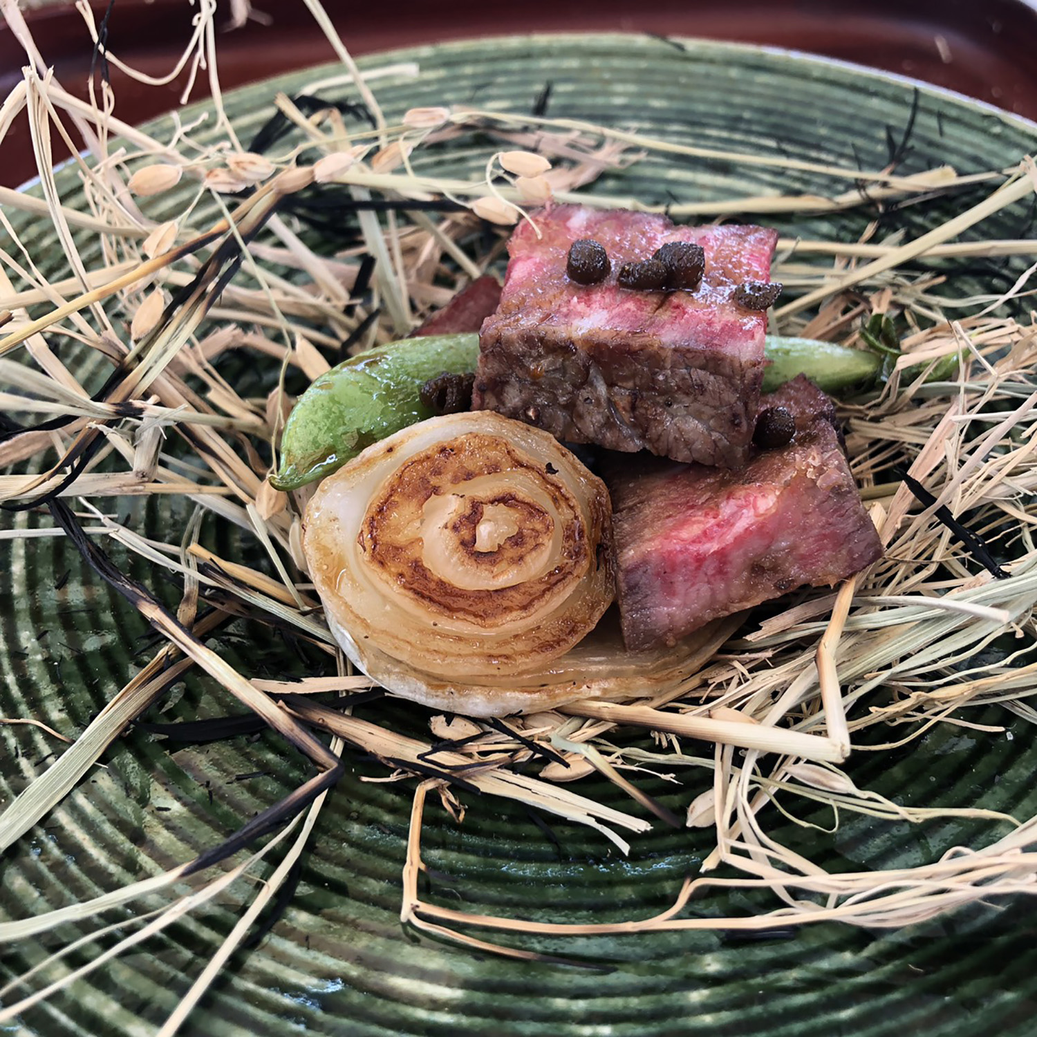 料理名:経産牛の藁焼き 山椒醤油 ~牛が食べた藁の香り~