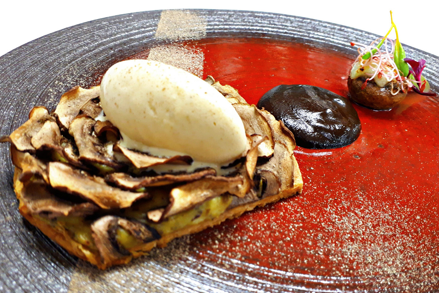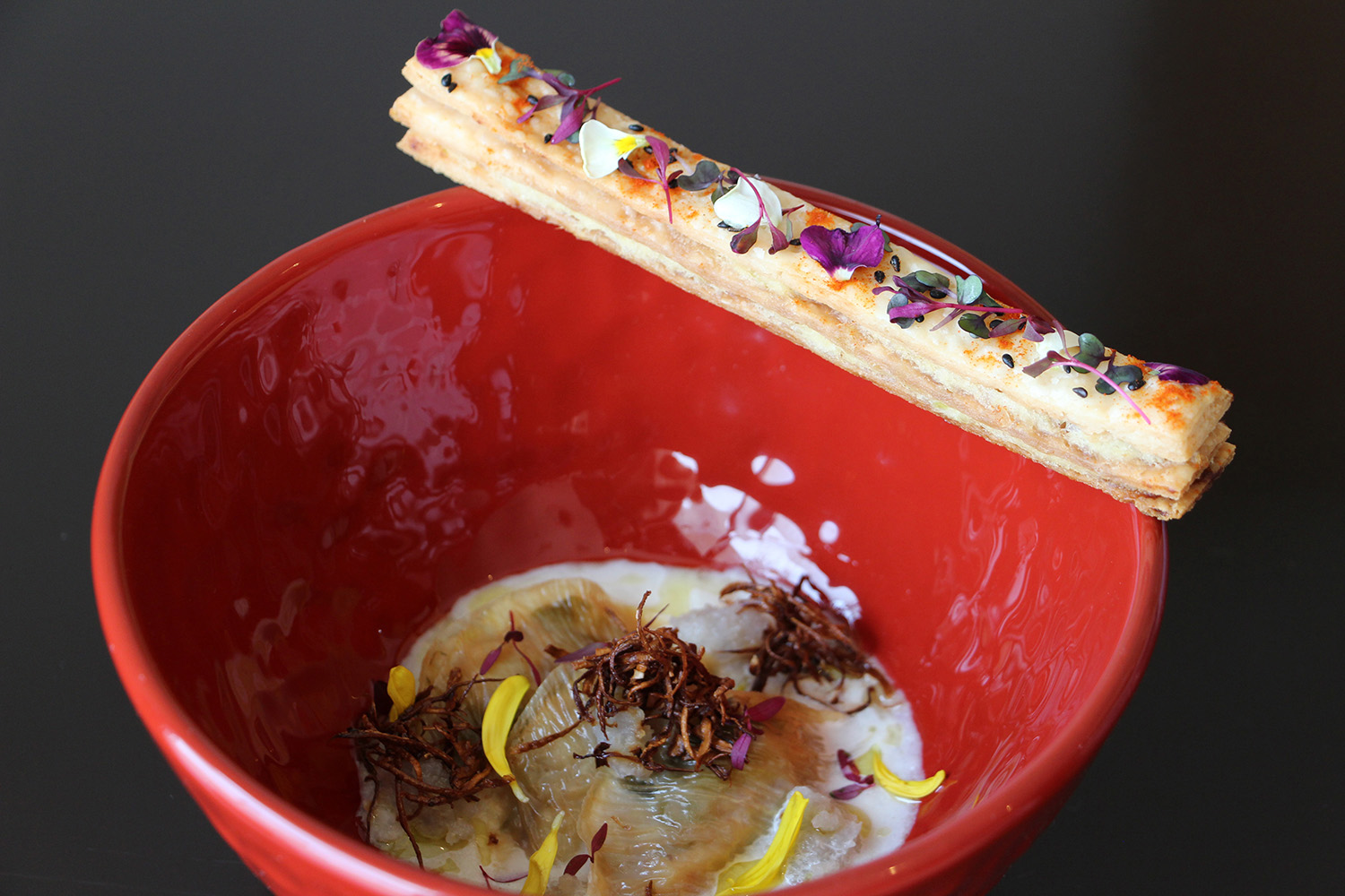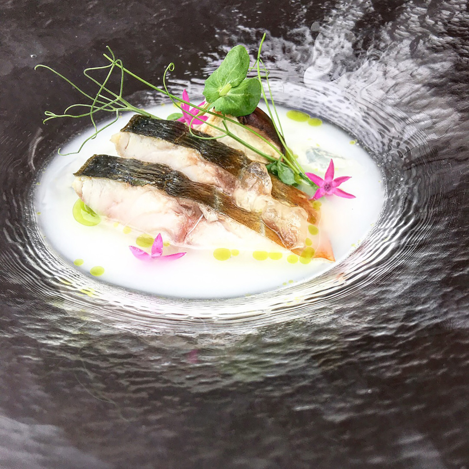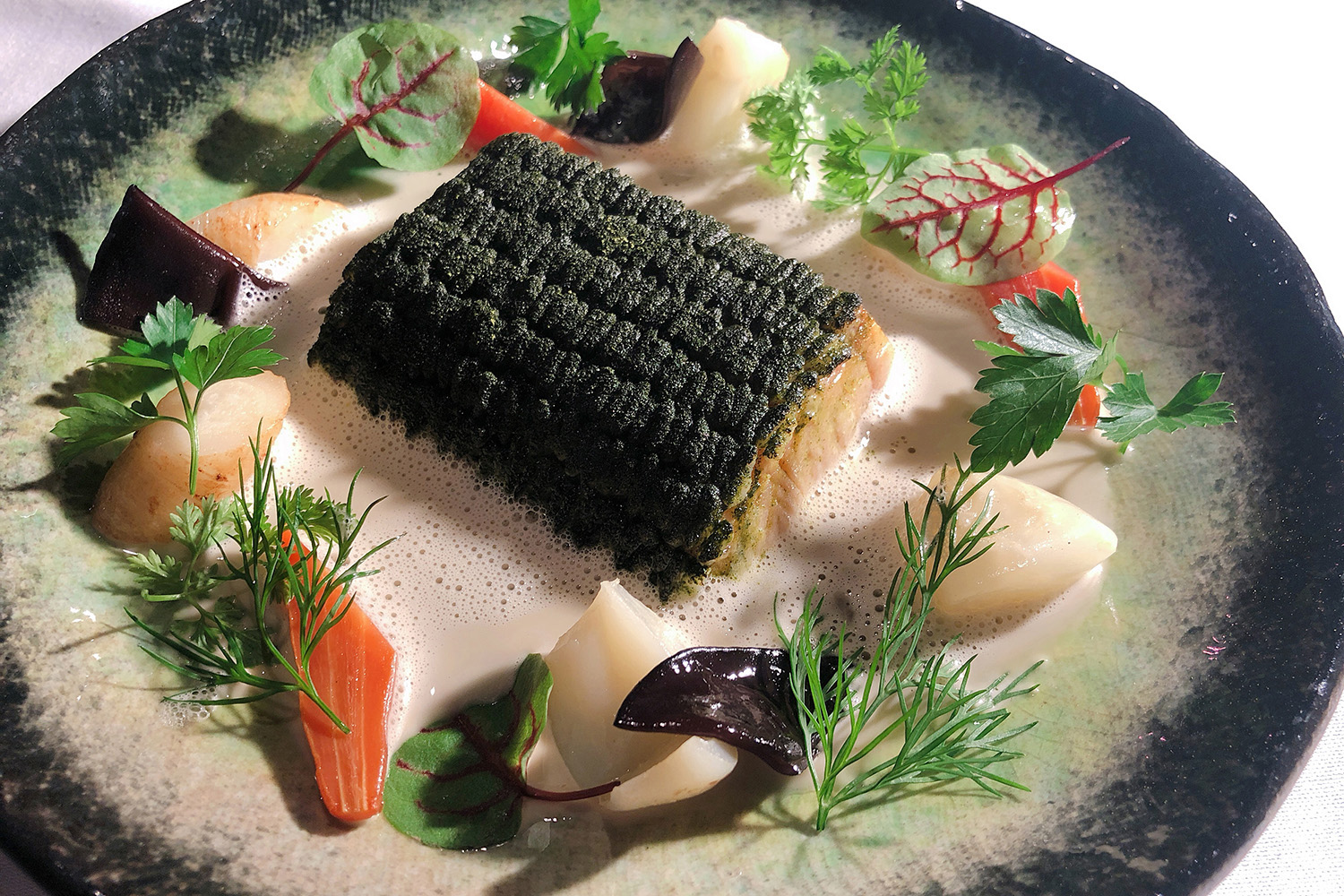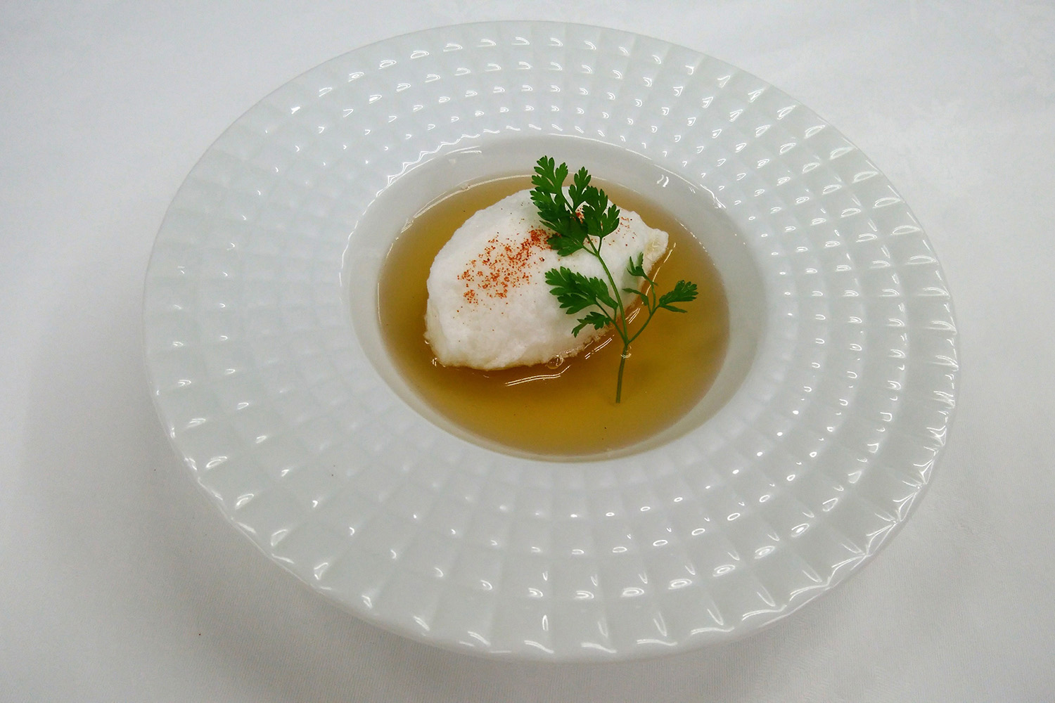 料理名:桜鱒三層のキュイッソン お米の鱗焼き じゃがいものブイヨン
