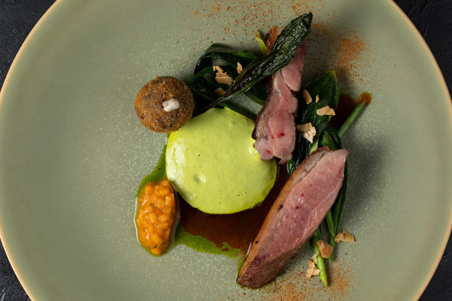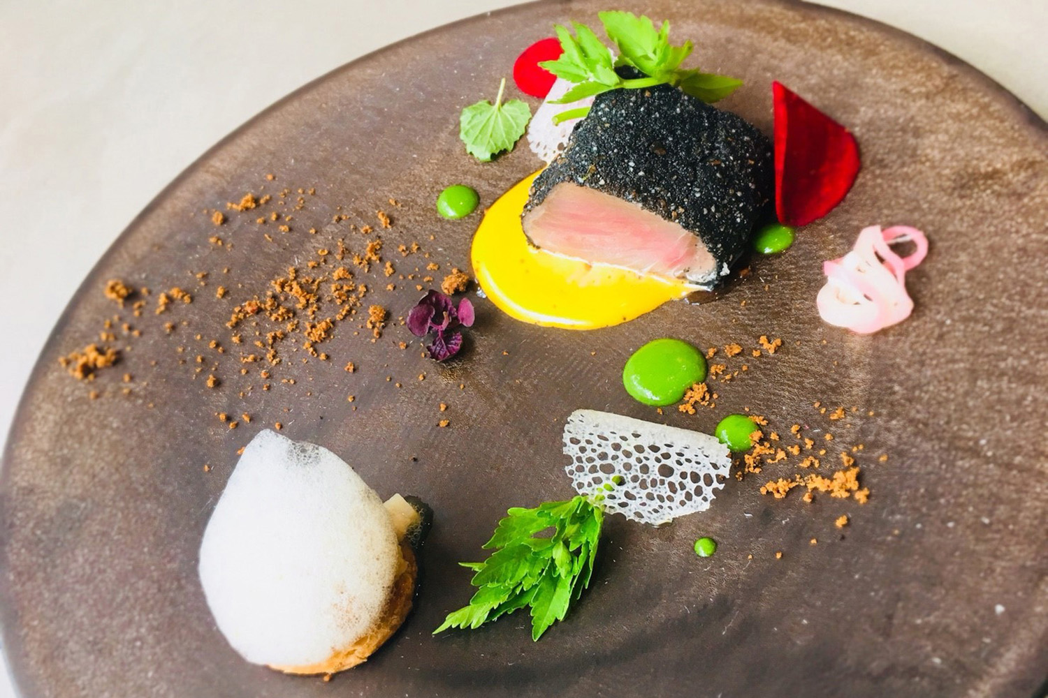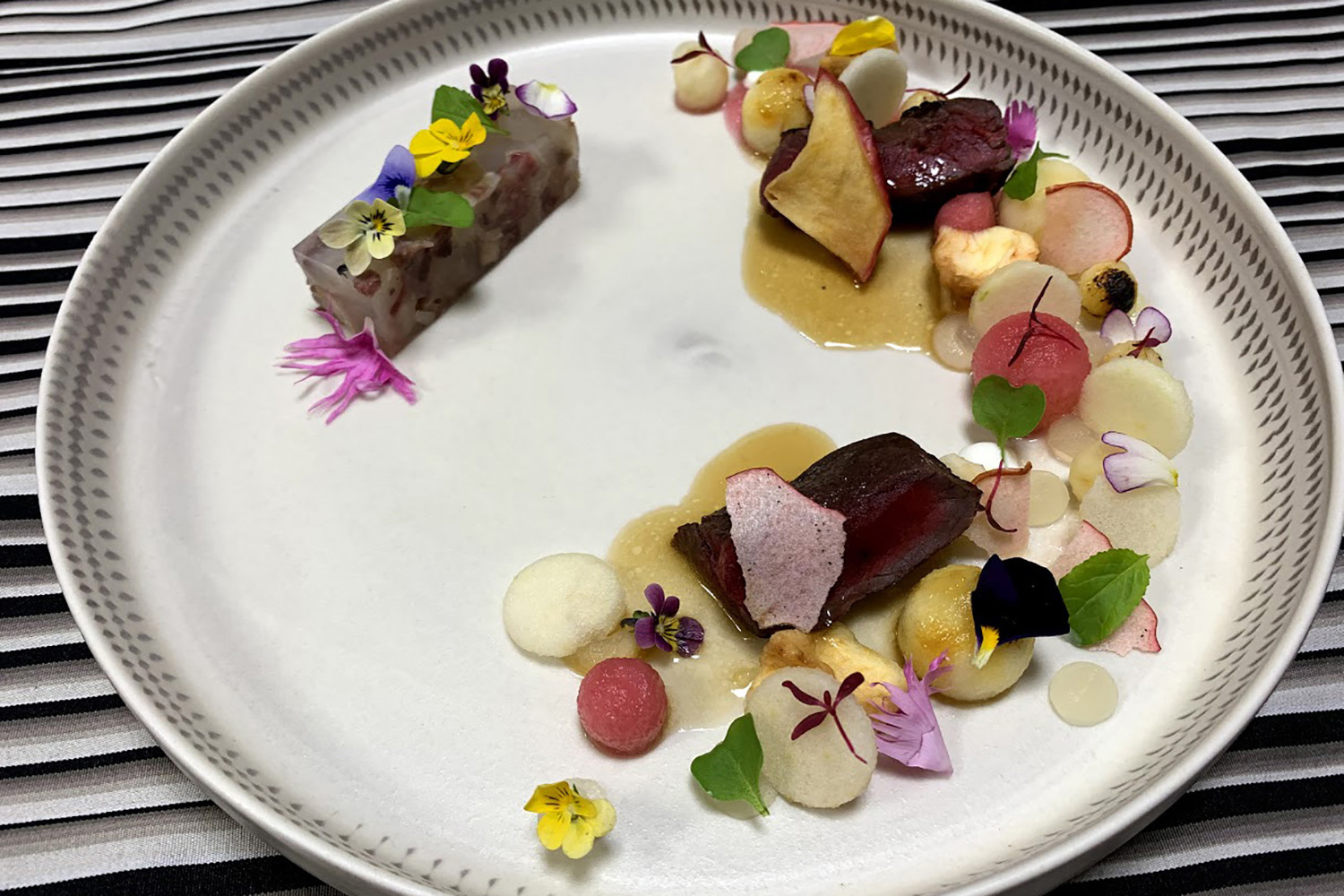 料理名:七谷鴨と葱のデクリネゾン ビワとライムのコンディモン