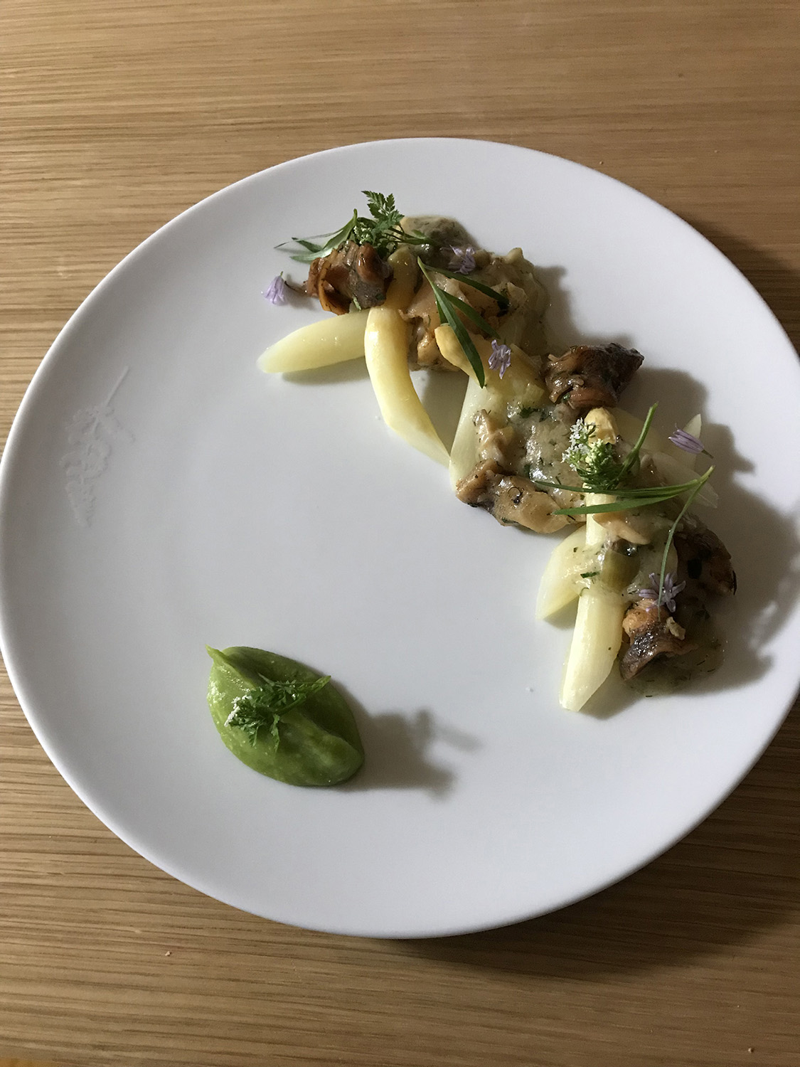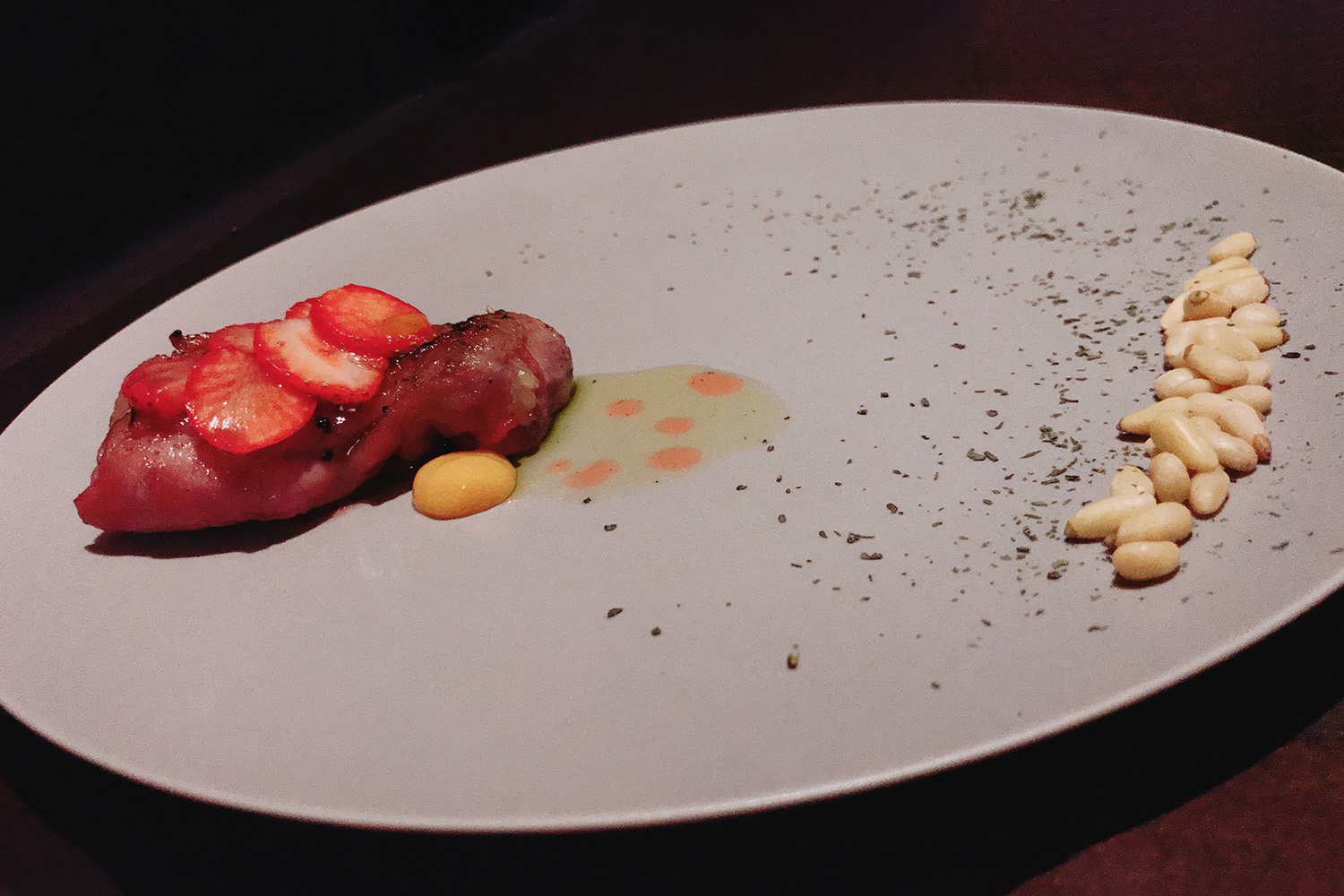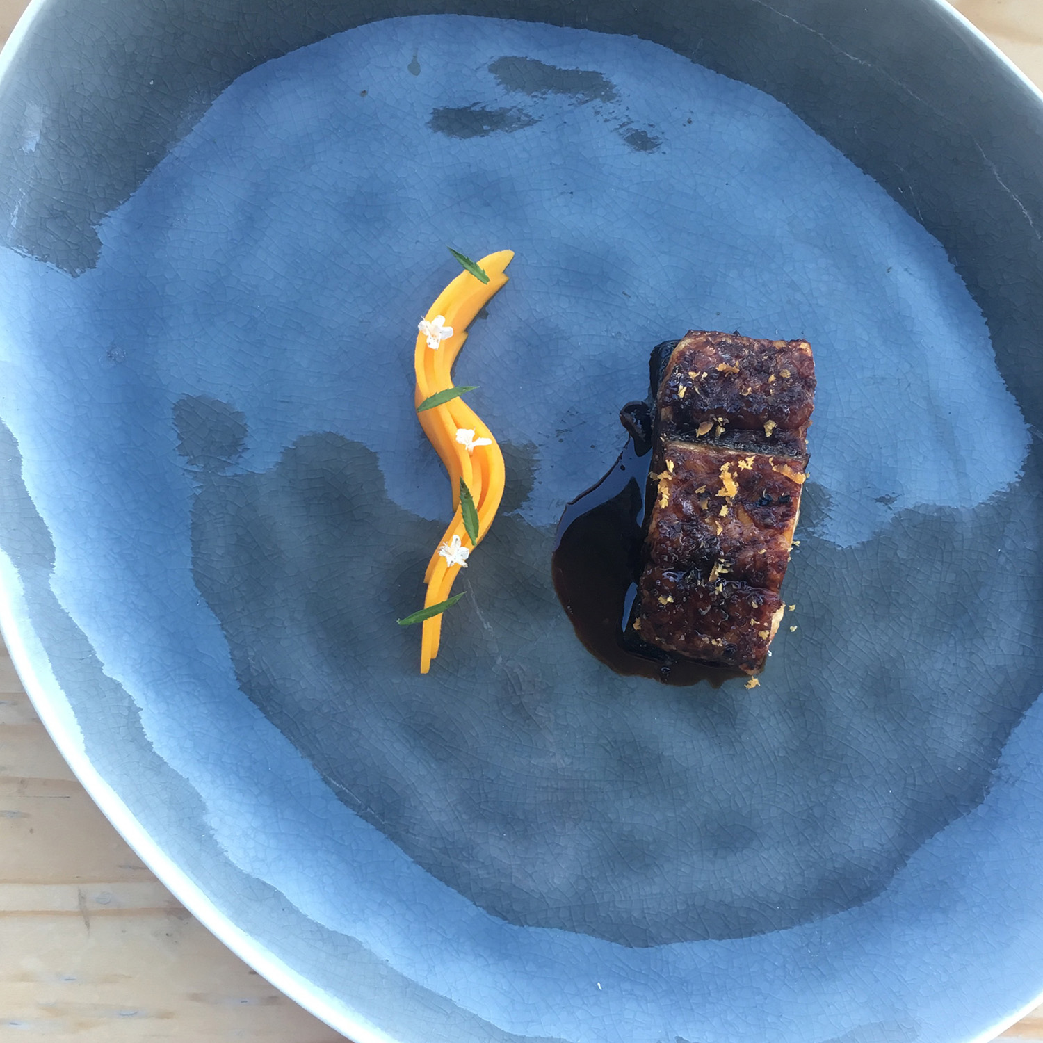 料理名:七谷鴨と葱のデクリネゾン ビワとライムのコンディモン