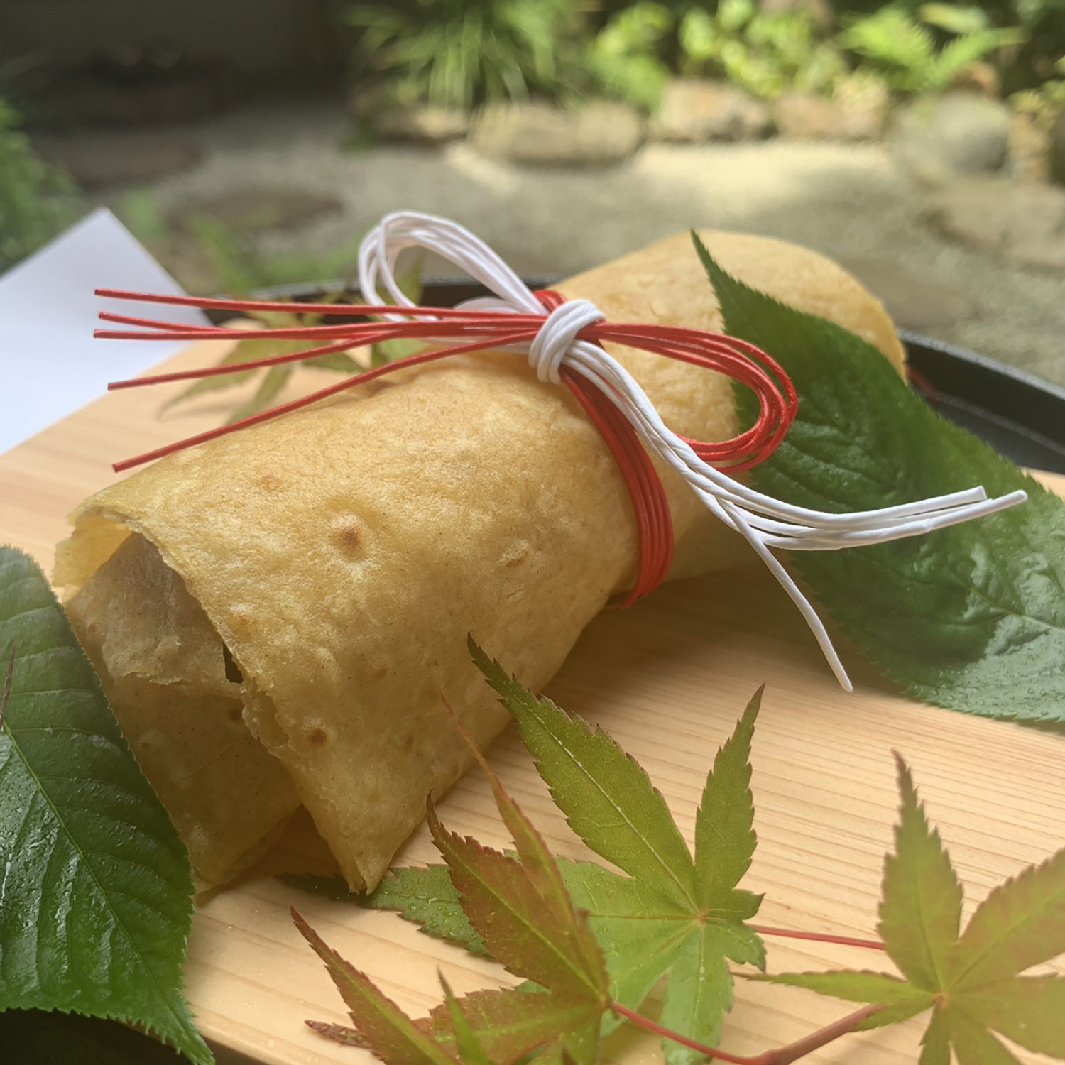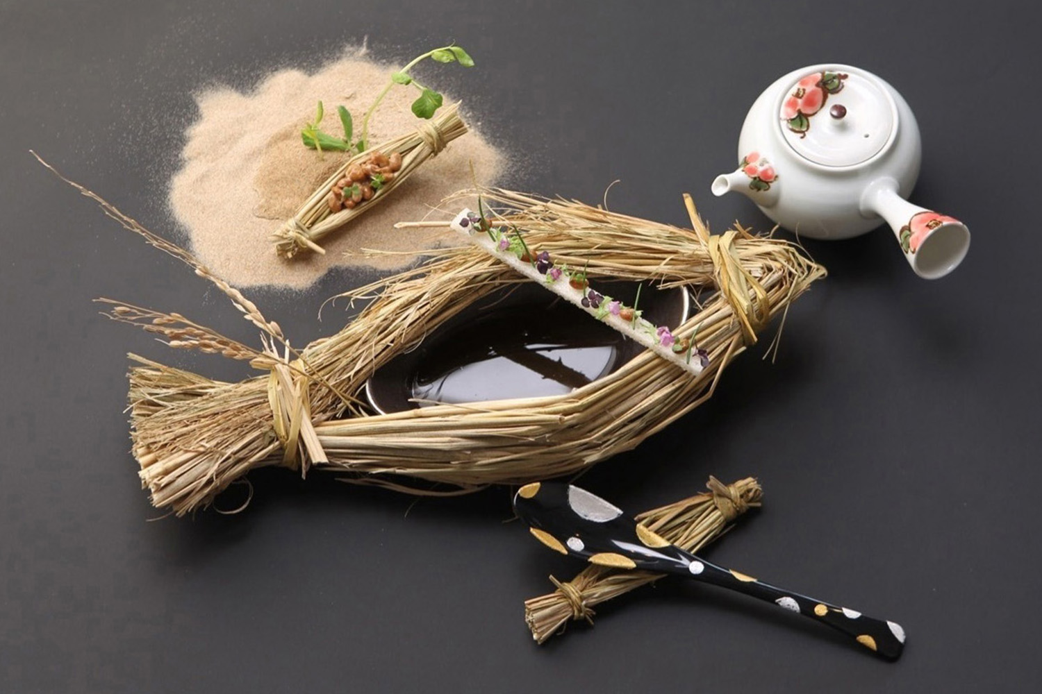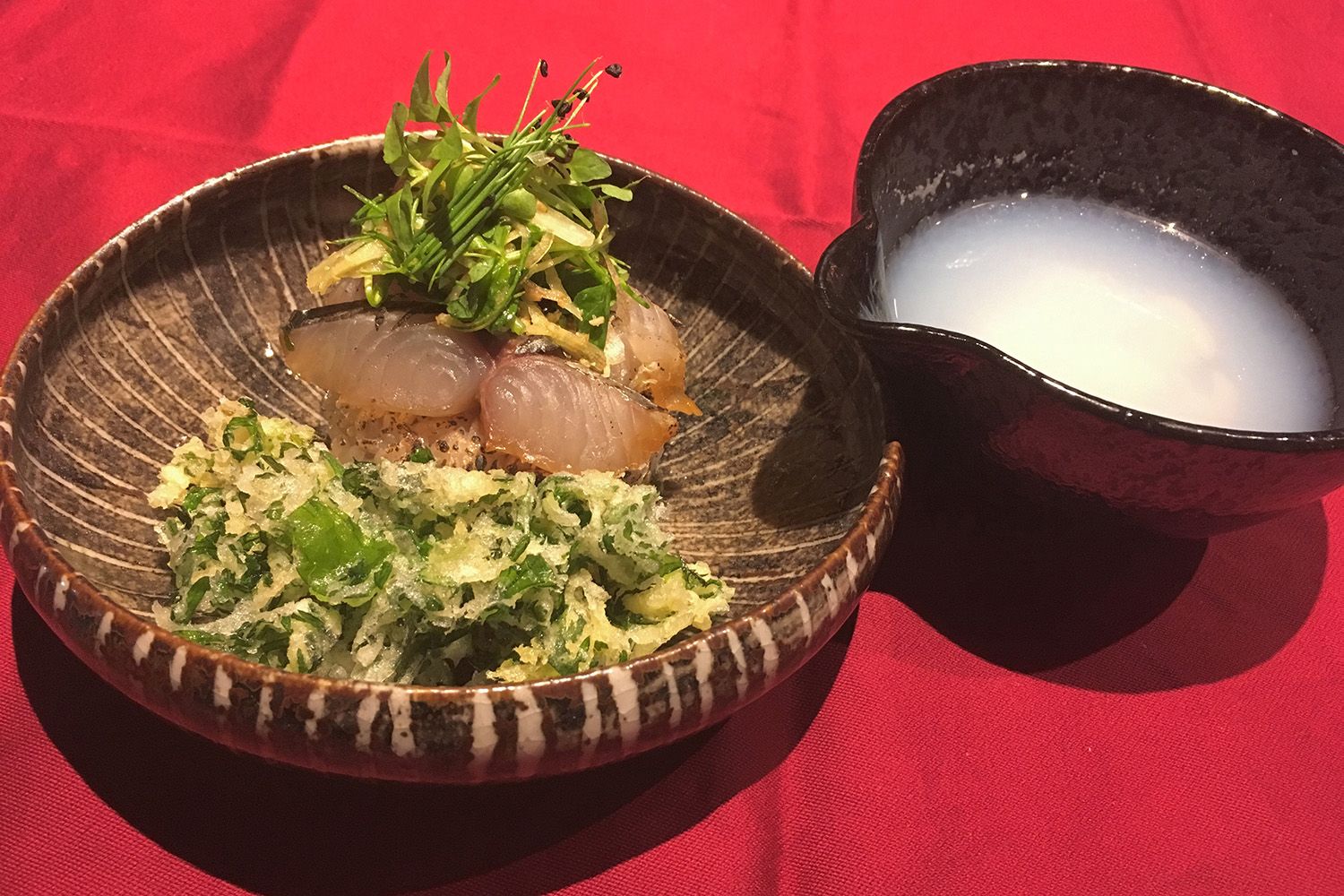 料理名:玄米で包む、鮎の麹漬け揚げ、鮎肝醤と酵素玄米とろみ酢で~日本から世界への贈り物~