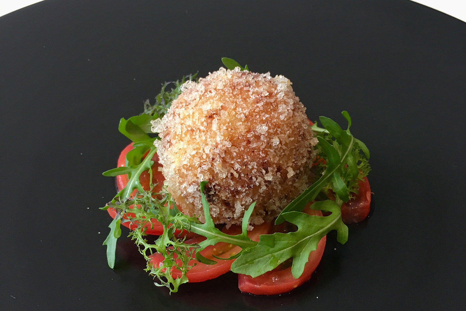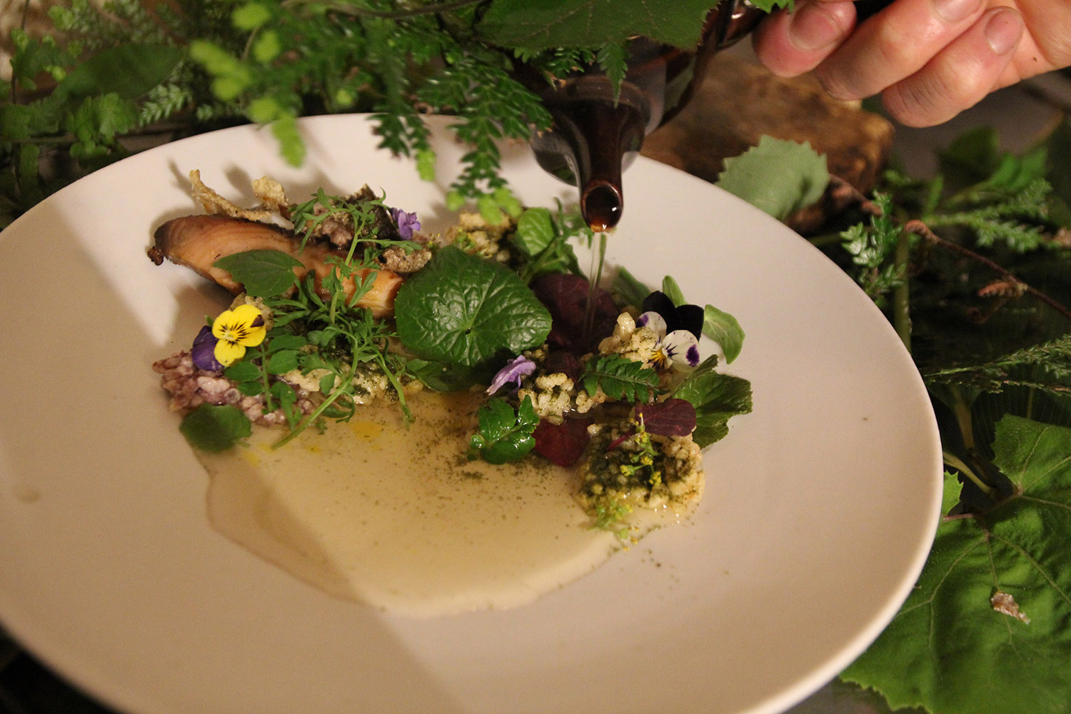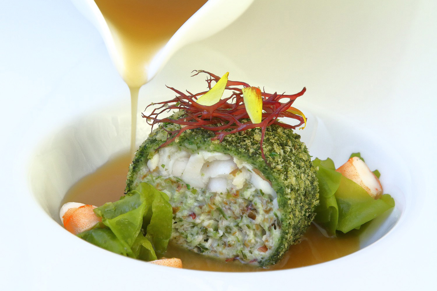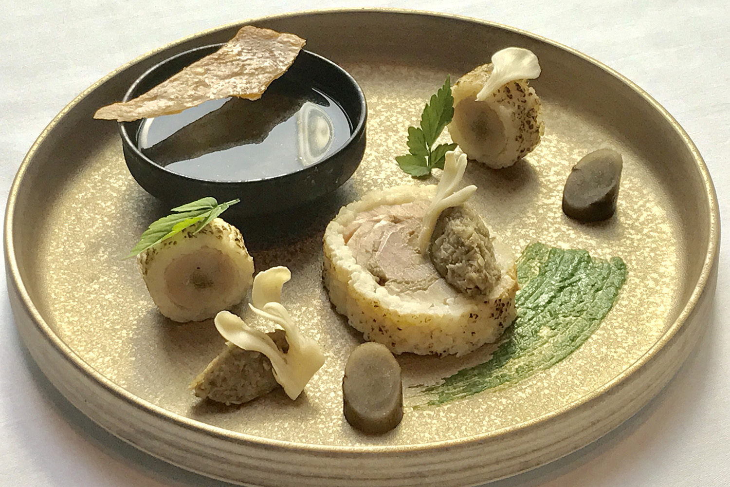 料理名:玄米で包む、鮎の麹漬け揚げ、鮎肝醤と酵素玄米とろみ酢で~日本から世界への贈り物~