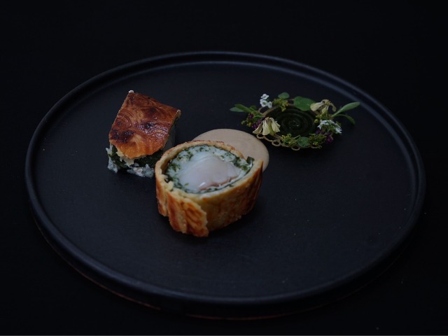 料理名:古代米と越中バイ貝のリゾット 自家製すがもの板海苔と昆布ピュレ 海水のソース